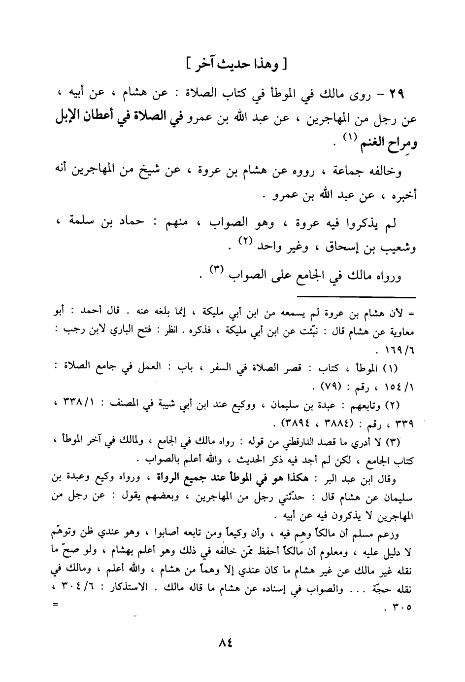 29 - رَوَى مَالِكٌ فِي الْمُوَطَّإِ فِي كِتَابِ الصَّلاةِ عَنْ هِشَامٍ عَنْ أَبِيهِ عَنْ رَجُلٍ مِنَ الْمُهَاجِرِينَ عَنْ عَبْدِ اللَّهِ بْنِ عَمْرٍو فِي الصَّلاةِ فِي أَعْطَانِ الإِبِلِ وَمُرَاحِ الْغَنَمِ