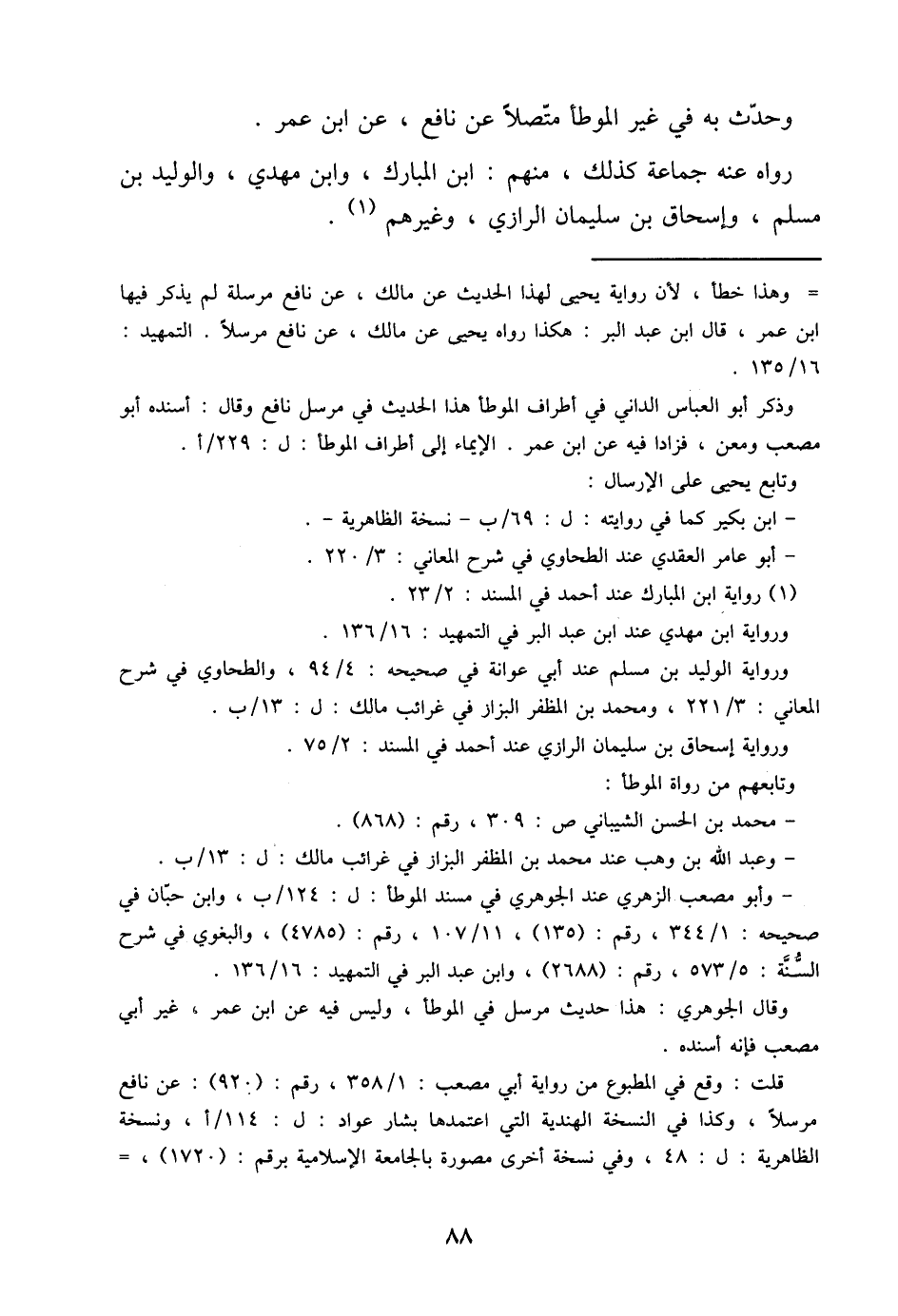 وَحَدَّثَ بِهِ فِي غَيْرِ الْمُوَطَّإِ مُتَّصِلا عَنْ نَافِعٍ عَنِ ابْنِ عُمَرَ