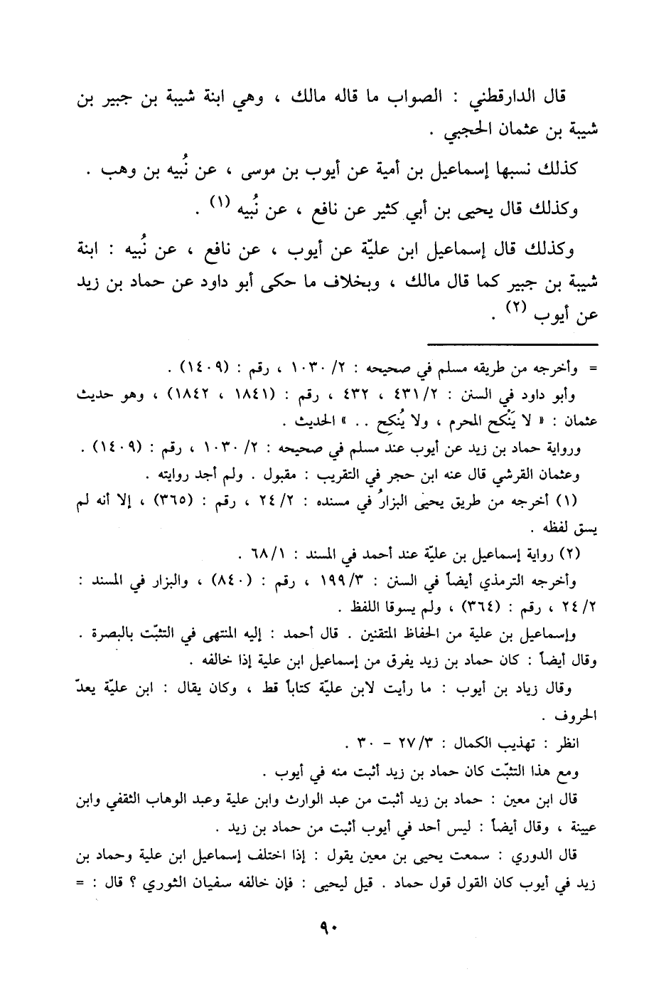 قَالَ الدَّارَقُطْنِيُّ الصَّوَابُ مَا قَالَهُ مَالِكٌ وَهِيَ ابْنَةُ شَيْبَةَ بْنِ جُبَيْرِ بْنِ شَيْبَةَ بْنِ عُثْمَانَ الْحَجَبِيِّ