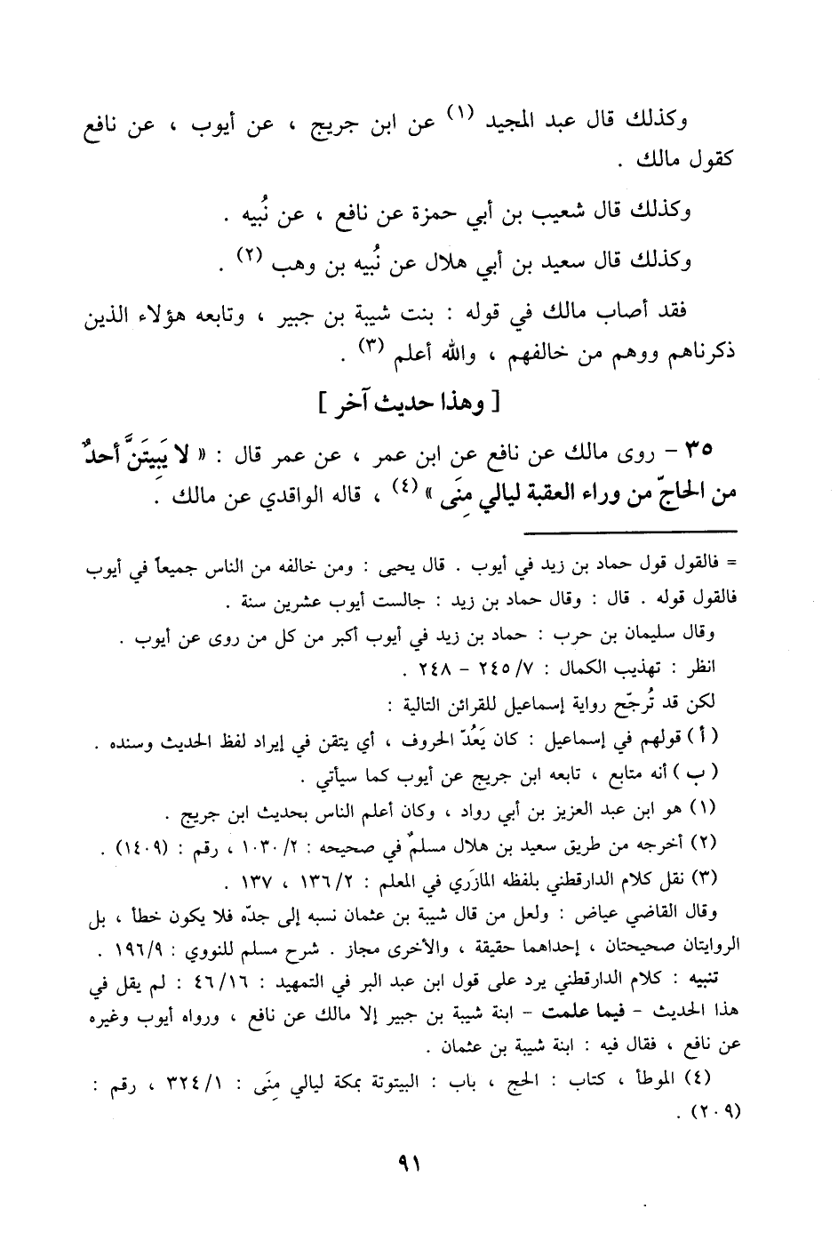 35 - رَوَى مَالِكٌ عَنْ نَافِعٍ عَنِ ابْنِ عُمَرَ عَنْ عُمَرَ قَالَ (لَا يَبِيتَنَّ أَحَدٌ مِنَ الْحَاجِّ مِنْ وَرَاءِ الْعَقَبَةِ لَيَالِي مِنًى) قَالَهُ الْوَاقِدِيُّ عَنْ مَالك