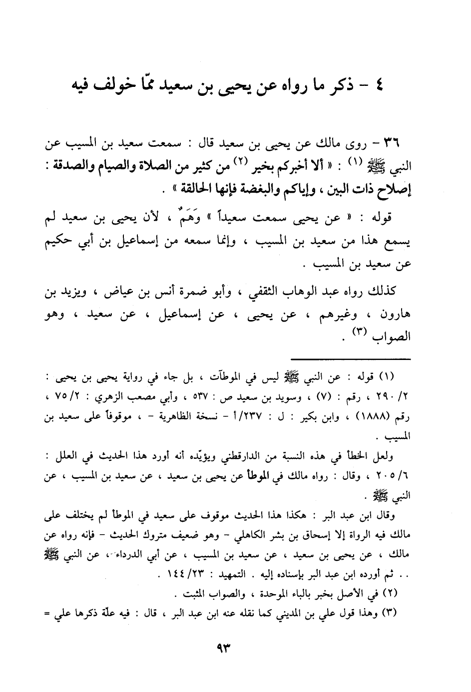 36 - رَوَى مَالِكٌ عَنْ يَحْيَى بْنِ سَعِيدٍ قَالَ سَمِعْتُ سَعِيدَ بْنَ الْمُسَيِّبِ عَنِ النَّبِيِّ صَلَّى اللَّهُ عَلَيْهِ وَسَلَّمَ (أَلا أُخْبِرُكُمْ بِخَيْرٍ مِنْ كَثِيرٍ مِنَ الصَّلاةِ وَالصِّيَامِ وَالصَّدَقَةِ إِصْلاحُ ذَاتِ الْبَيْنِ وَإِيَّاكُمْ وَالْبِغْضَةَ فَإِنَّهَا الْحَالِقَة)