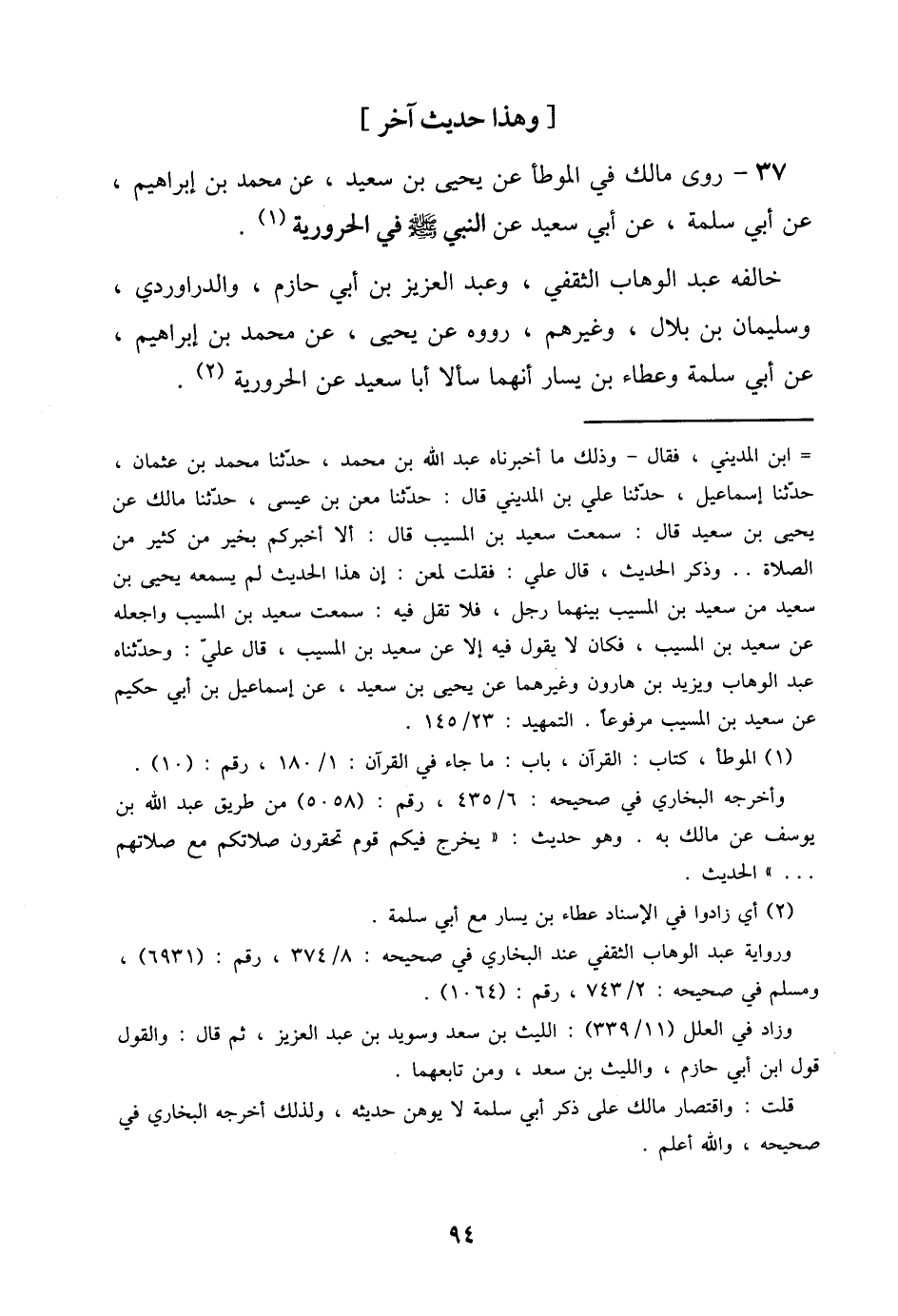 37 - رَوَى مَالِكٌ فِي الْمُوَطَّإِ عَنْ يَحْيَى بْنِ سَعِيدٍ عَنْ مُحَمَّدِ بْنِ إِبْرَاهِيمَ عَنْ أَبِي سَلَمَةَ عَنْ أَبِي سَعِيدٍ عَنِ النَّبِيِّ صَلَّى اللَّهُ عَلَيْهِ وَسَلَّمَ فِي الْحَرُورِيَّةِ