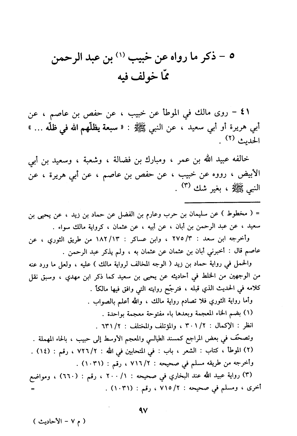 41 - رَوَى مَالِكٌ فِي الْمُوَطَّإِ عَنْ خُبَيْبٍ عَنْ حَفْصِ بْنِ عَاصِمٍ عَنْ أَبِي هُرَيْرَةَ أَوْ أَبِي سَعِيدٍ عَنِ النَّبِي صلى الله عَلَيْهِ وَسلم (سَبْعَةٌ يُظِلُّهُمُ اللَّهُ فِي ظِلِّهِ) الْحَدِيثَ