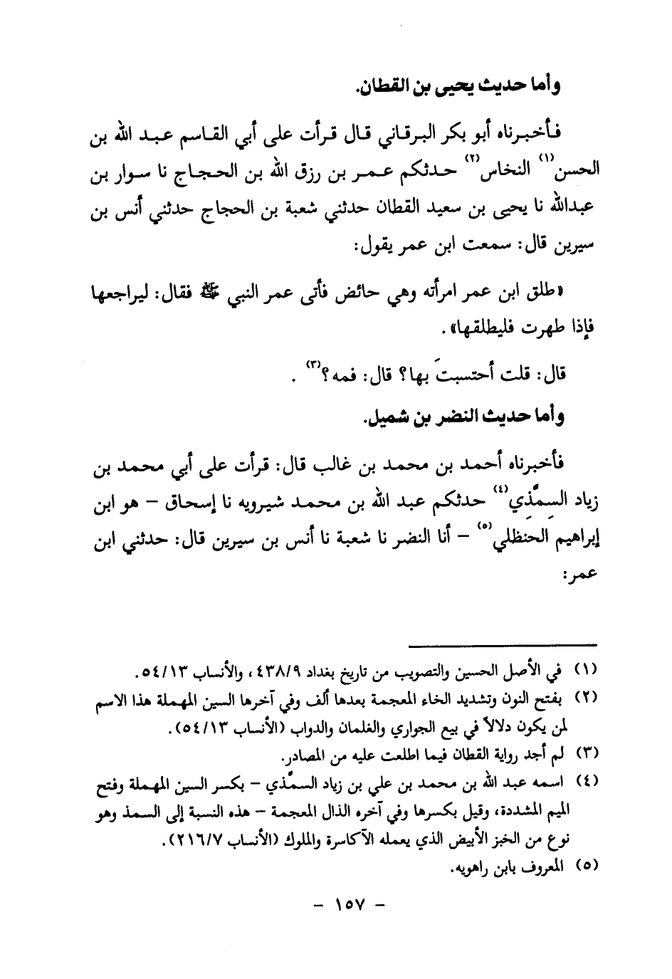 فأخبرناه أَحْمَدُ بْنُ مُحَمَّدِ بْنِ غَالِبٍ قَالَ: قَرَأْتُ عَلَى أَبِي مُحَمَّدِ بْنِ زِيَادٍ السِّمِّذِيِّ4 حَدَّثَكُمْ عَبْدُ الله بن محمد شِيرَوَيْهِ نا إِسْحَاقُ – هُوَ ابْنُ إبراهيم الحنظلي5 - أنا النضر نا شعبة ننا أَنَسُ بْنُ سِيرِينَ قَالَ: حَدَّثَنِي ابن عمر:
