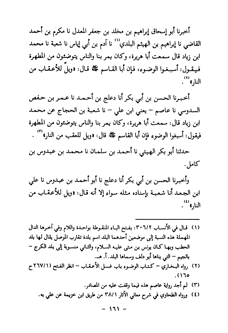 أَخْبَرَنَا الْحَسَنُ بْنُ أَبِي بَكْرٍ أنا دَعْلَجُ بْنُ أَحْمَدَ نا عُمَرُ بْنُ حَفْصٍ السَّدُوسِيُّ نا عَاصِمٌ – يَعْنِي ابْنَ عَلِيٍّ – نا شُعْبَةُ بْنُ الْحَجَّاجِ عَنْ مُحَمَّدِ بْنُ زِيَادٍ قَالَ: سَمِعْتُ أَبَا هُرَيْرَةَ، وَكَانَ يَمُرُّ بِنَا وَالنَّاسُ يَتَوَضَّئُونَ مِنَ الْمَطْهَرَةِ فَيَقُولُ: أَسْبِغُوا الْوُضُوءَ فَإِنَّ أَبَا الْقَاسِمِ صَلَّى اللَّهُ عَلَيْهِ وَسَلَّمَ قَالَ: " وَيْلٌ للعقب من النار "3.
