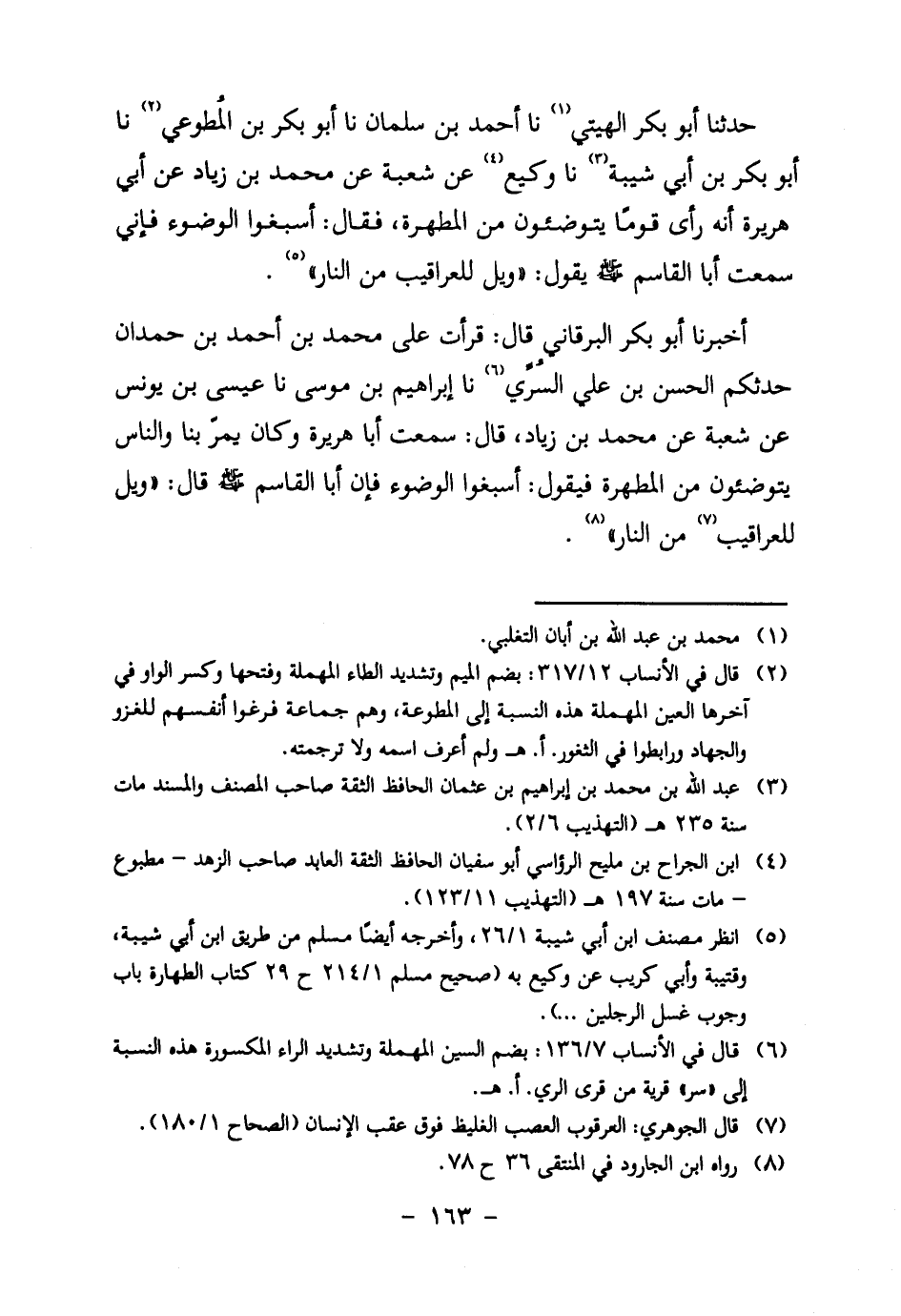 حدثنا أَبُو بَكْرٍ الْهِيتِيُّ1 نا أَحْمَدُ بْنُ سَلْمَانَ نا أَبُو بَكْرِ بْنُ المُطوعي2 نا أَبُو بَكْرِ بْنُ أَبِي شَيْبَةَ3 نا وَكِيعٌ4 عَنْ شُعْبَةَ عَنْ مُحَمَّدِ بْنِ زِيَادٍ عَنْ أَبِي هُرَيْرَةَ أَنَّهُ رَأَى قَوْمًا يَتَوَضَّئُونَ مِنَ الْمَطْهَرَةِ، فَقَالَ: أَسْبِغُوا الْوُضُوءَ فَإِنِّي سَمِعْتُ أَبَا الْقَاسِمِ صَلَّى اللَّهُ عَلَيْهِ وَسَلَّمَ يَقُولُ: " وَيْلٌ لِلْعَرَاقِيبِ مِنَ النار " 5.
