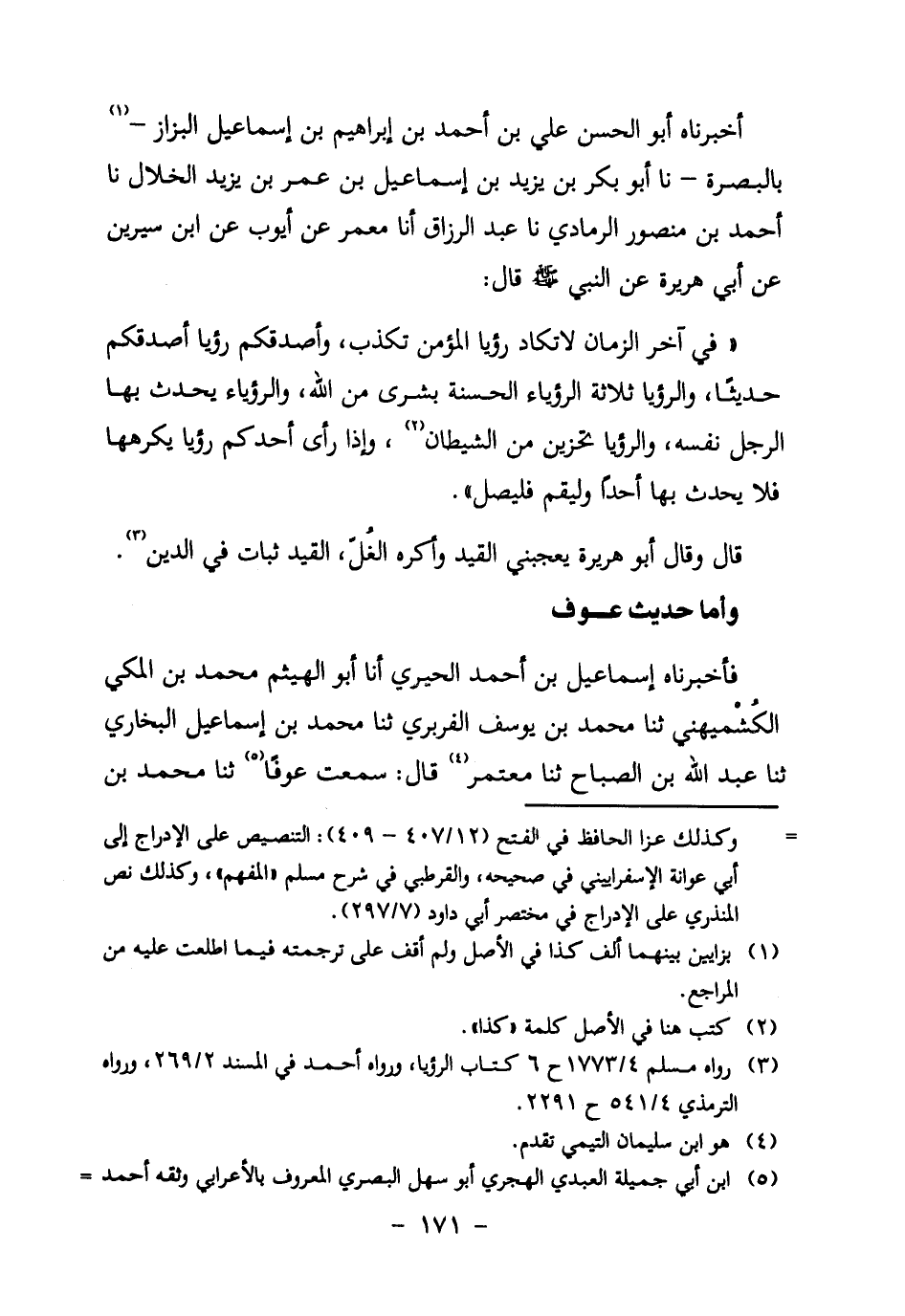 فَأَخْبَرَنَاهُ إِسْمَاعِيلُ بْنُ أَحْمَدَ الْحِيرِيُّ أنا أَبُو الْهَيْثَمِ مُحَمَّدُ بْنُ الْمَكِّيِّ الكُشْميهني ثنا محمد بن يوسف الفربري ثنا محمد بن إسماعيل البخاري ثنا عبد الله بن الصباح ثنا معتمر4 قال: سمعت عوفًا5 ثنا محمد بن