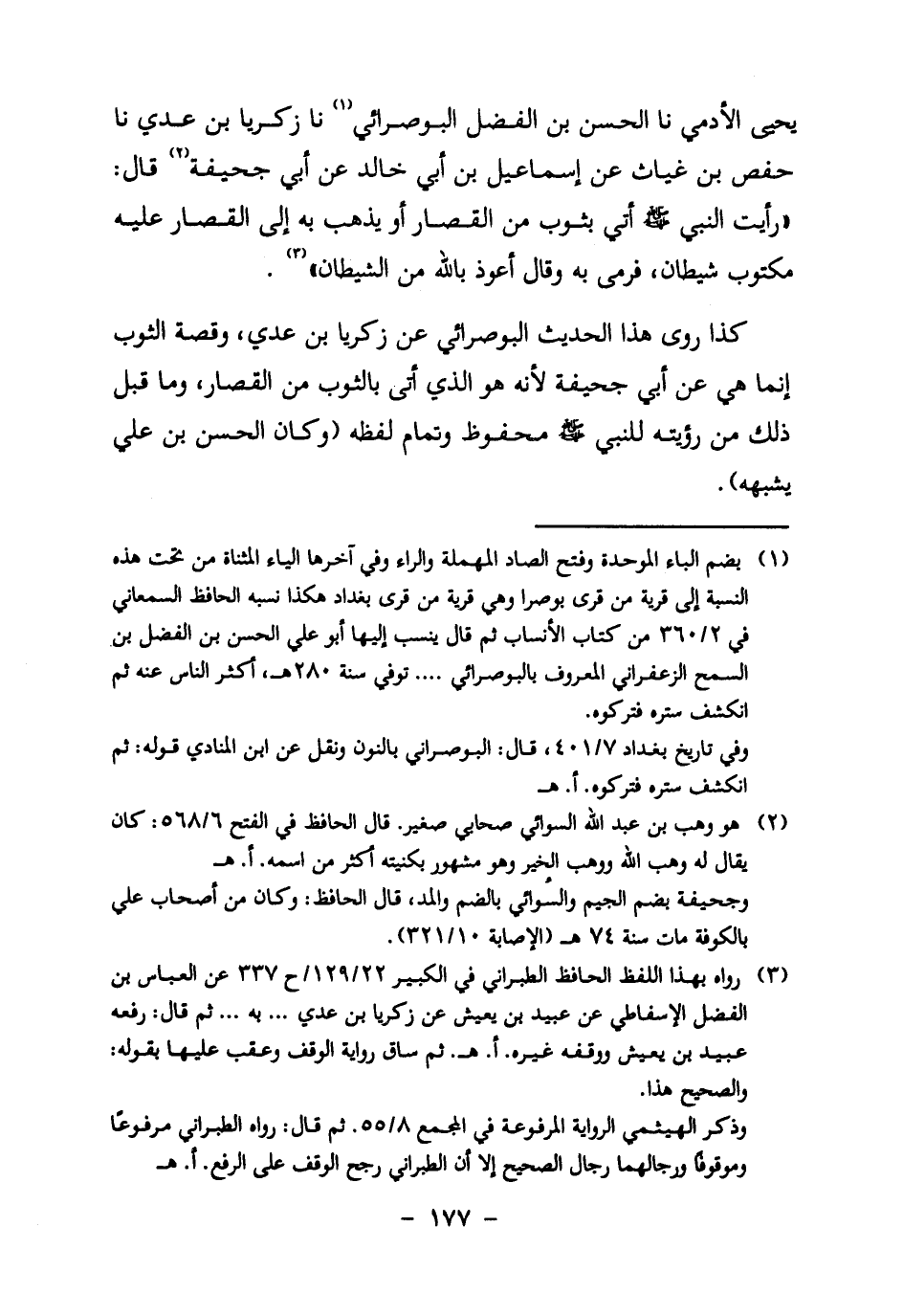 يَحْيَى الآدَمِيُّ نا الْحَسَنُ بْنُ الفضل البوصرائي1 نا زَكَرِيَّا بْنُ عَدِيٍّ نا حَفْصُ بْنُ غِيَاثٍ عَنْ إِسْمَاعِيلَ بْنِ أَبِي خَالِدٍ عَنْ أَبِي جُحَيْفَةَ2 قَالَ: " رَأَيْتُ النَّبِيَّ صَلَّى اللَّهُ عَلَيْهِ وَسَلَّمَ أتي بِثَوْبٍ مِنَ الْقَصَّارِ أَوْ يَذْهَبُ بِهِ إِلَى الْقَصَّارِ عَلَيْهِ مَكْتُوبٌ شَيْطَانٌ، فَرَمَى بِهِ وَقَالَ: أَعُوذُ بِاللَّهِ مِنَ الشَّيْطَانِ " 3.