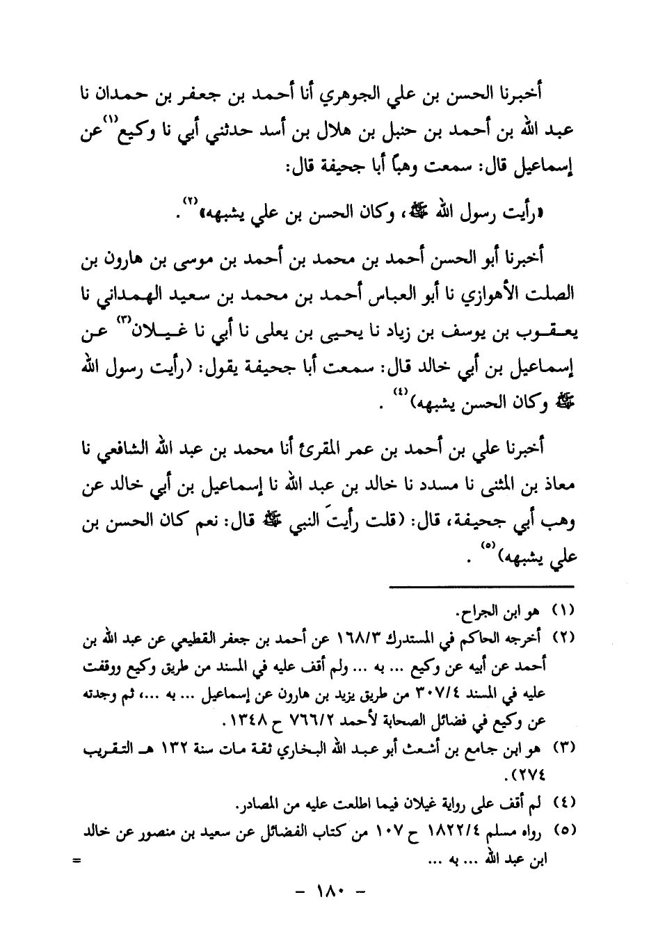 أَخْبَرَنَا عَلِيُّ بْنُ أَحْمَدَ بْنِ عُمَرَ الْمُقْرِئُ أنا مُحَمَّدُ بْنُ عَبْدِ اللَّهِ الشَّافِعِيُّ نا مُعَاذُ بْنُ الْمُثَنَّى نا مُسَدَّدٌ نا خَالِدُ بْنُ عَبْدِ اللَّهِ نا إِسْمَاعِيلَ بْنِ أَبِي خَالِدٍ عَنْ وَهْبٍ أَبِي جُحَيْفَةَ، قَالَ: " قُلْتُ رَأَيْتُ النَّبِيَّ صَلَّى اللَّهُ عَلَيْهِ وَسَلَّمَ؟ قَالَ: نَعَمْ، كَانَ الْحَسَنُ بن علي يشبهه "5.
