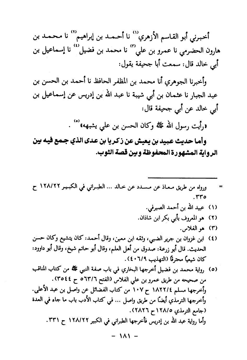 أَخْبَرَنِي أَبُو الْقَاسِمِ الأَزْهَرِيُّ1 نا أَحْمَدُ بْنُ إِبْرَاهِيمَ2 نا مُحَمَّدُ بْنُ هَارُونَ الْحَضْرَمِيُّ نا عَمْرُو بْنُ عَلِيٍّ3 نا مُحَمَّدُ بْنُ فُضَيْلٍ4 نا إِسْمَاعِيلُ بْنُ أَبِي خَالِدٍ قَالَ: سَمِعْتُ أَبَا جُحَيْفَةَ يقول: