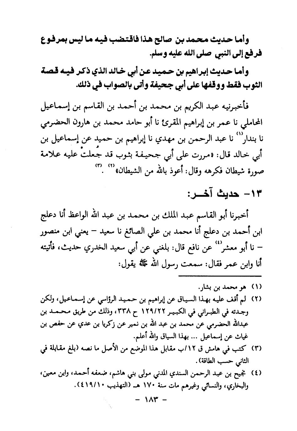 فَأَخْبَرَنِيهِ عَبْدُ الْكَرِيمِ بْنُ مُحَمَّدِ بْنِ أَحْمَدَ بْنِ الْقَاسِمِ بْنِ إِسْمَاعِيلَ الْمَحَامِلِيُّ نا عُمَرُ بْنُ إِبْرَاهِيمَ الْمُقْرِئُ نا أَبُو حَامِدٍ مُحَمَّدُ بْنُ هَارُونَ الْحَضْرَمِيُّ نا بُنْدَارٌ1 نا عَبْدُ الرَّحْمَنِ بْنُ مَهْدِيٍّ نا إِبْرَاهِيمُ بْنُ حُمَيْدٍ عَنْ إِسْمَاعِيلَ بْنِ أَبِي خَالِدٍ قَالَ: " مَرَرْتُ عَلَى أَبِي جُحَيْفَةَ بِثَوْبٍ قَدْ جُعلت عَلَيْهِ عَلامَةً صُورَةَ شَيْطَانٍ فَكَرِهَهُ وَقَالَ: أَعُوذُ بِاللَّهِ مِنَ الشَّيْطَانِ "2.3