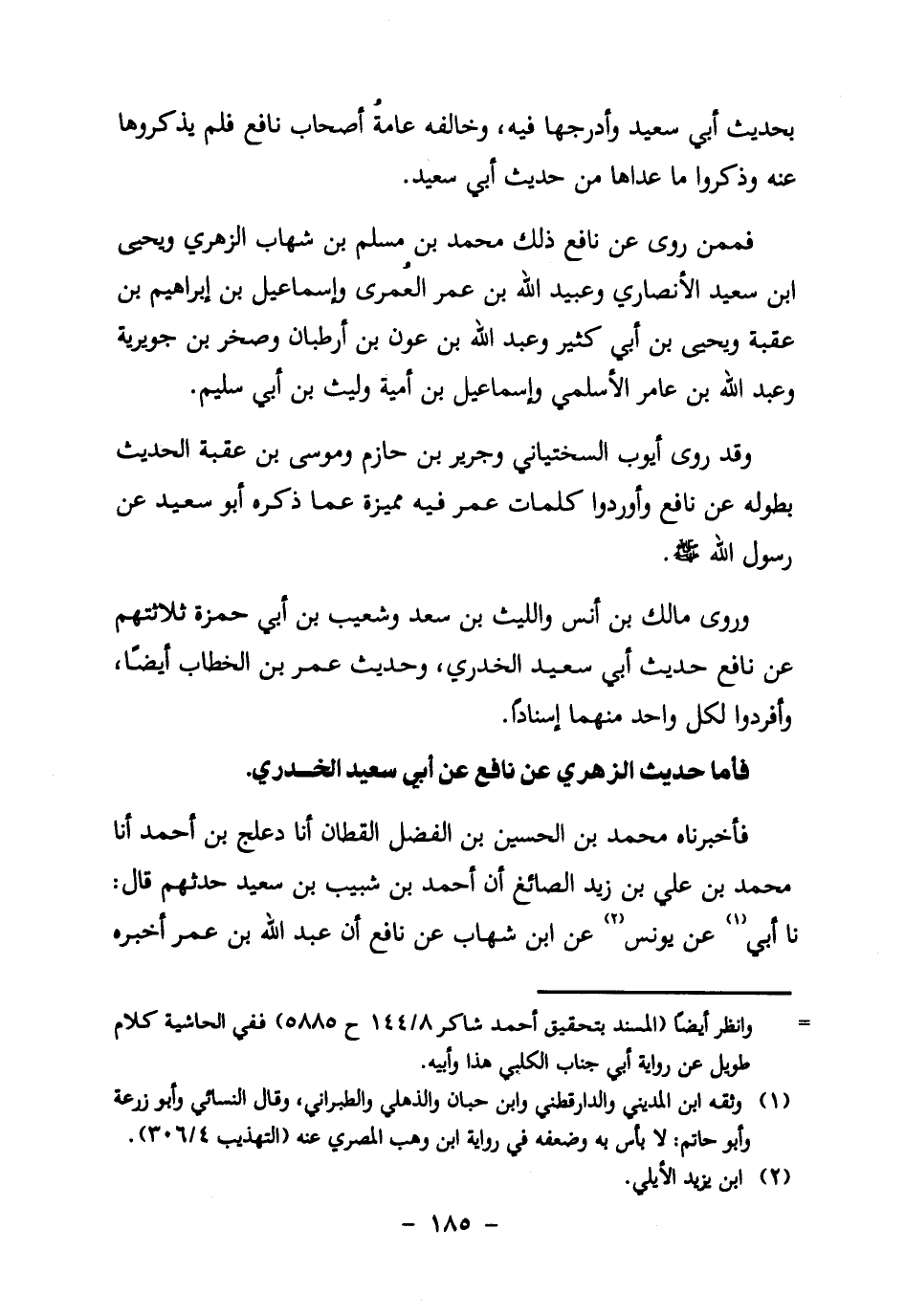 وَرَوَى مَالِكُ بْنُ أَنَسٍ وَاللَّيْثُ بْنُ سَعْدٍ وَشُعَيْبُ بْنُ أَبِي حَمْزَةَ ثَلاثَتُهُمْ عَنْ نَافِعٍ حَدِيثَ أَبِي سَعِيدٍ الْخُدْرِيِّ، وَحَدِيثَ عُمَرَ بْنِ الْخَطَّابِ أَيْضًا، وَأَفْرَدُوا لِكُلِّ وَاحِدٍ منهما إِسْنَادًا.