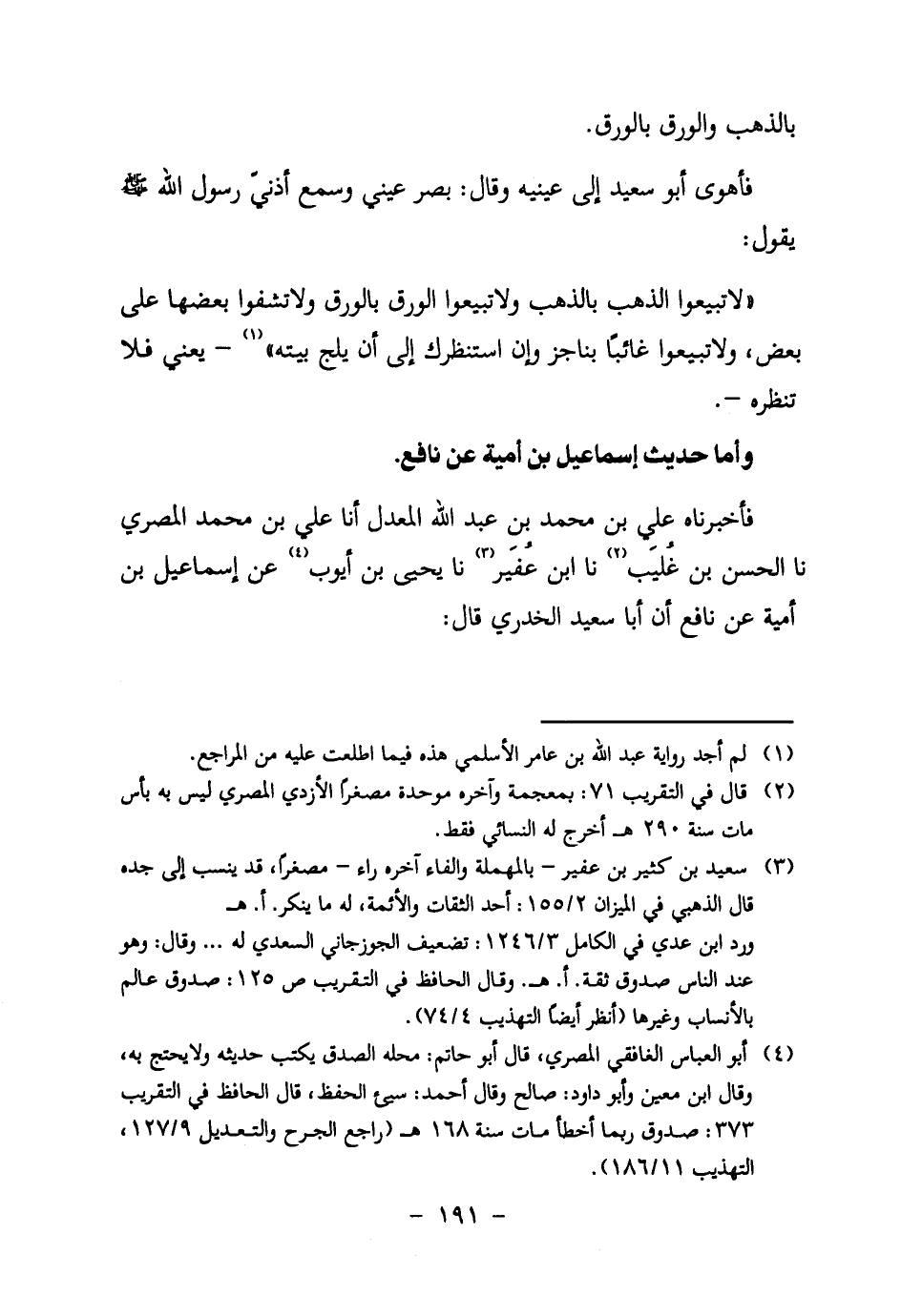 " لا تَبِيعُوا الذَّهَبَ بِالذَّهَبِ وَلا تَبِيعُوا الْوَرِقَ بِالْوَرِقِ وَلا تَشِفُّوا بَعْضَهَا عَلَى بَعْضٍ، وَلا تَبِيعُوا غَائِبًا بِنَاجِزٍ وَإِنِ اسْتَنْظَرَكَ إِلَى أَنْ يَلِجَ بَيْتَهُ " 1 – يَعْنِي فَلا تَنْظُرُهُ -.