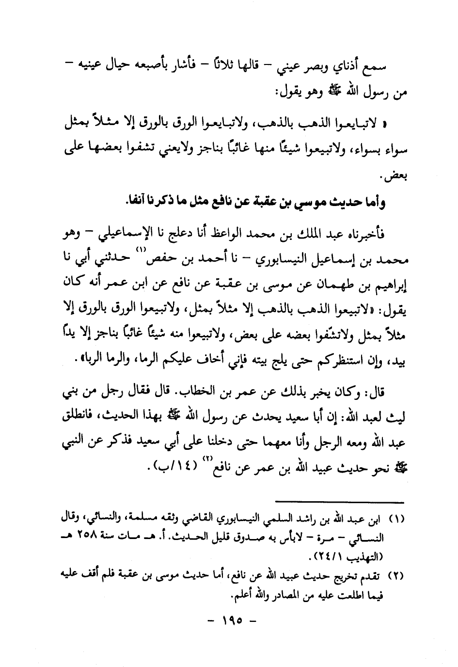 فأخبرناه عَبْدُ الْمَلِكِ بْنُ مُحَمَّدٍ الْوَاعِظُ أنا دَعْلَجٌ نا الإِسْمَاعِيلِيُّ – وَهُوَ مُحَمَّدُ بْنُ إِسْمَاعِيلَ النَّيْسَابُورِيُّ – نا أَحْمَدُ بْنُ حَفْصٍ1 حَدَّثَنِي أَبِي نا إِبْرَاهِيمُ بْنُ طَهْمَانَ عَنْ موسى بن عقبة عن نافع عَنِ ابْنِ عُمَرَ أَنَّهُ كَانَ يَقُولُ: " لا تَبِيعُوا الذَّهَبَ بِالذَّهَبِ إِلَّا مِثْلا بِمِثْلٍ، وَلا تَبِيعُوا الْوَرِقَ بِالْوَرِقِ إِلَّا مِثْلًا بِمِثْلٍ، وَلا تَشِفُّوا بَعْضَهُ عَلَى بَعْضٍ، وَلا تَبِيعُوا مِنْهُ شَيْئًا غَائِبًا بِنَاجِزٍ إِلَّا يَدًا بِيَدٍ، وَإِنِ اسْتَنْظَرَكُمْ حَتَّى يَلِجَ بَيْتَهُ فَإِنِّي أخاف عليكم الرما، والرما الرِّبَا ".