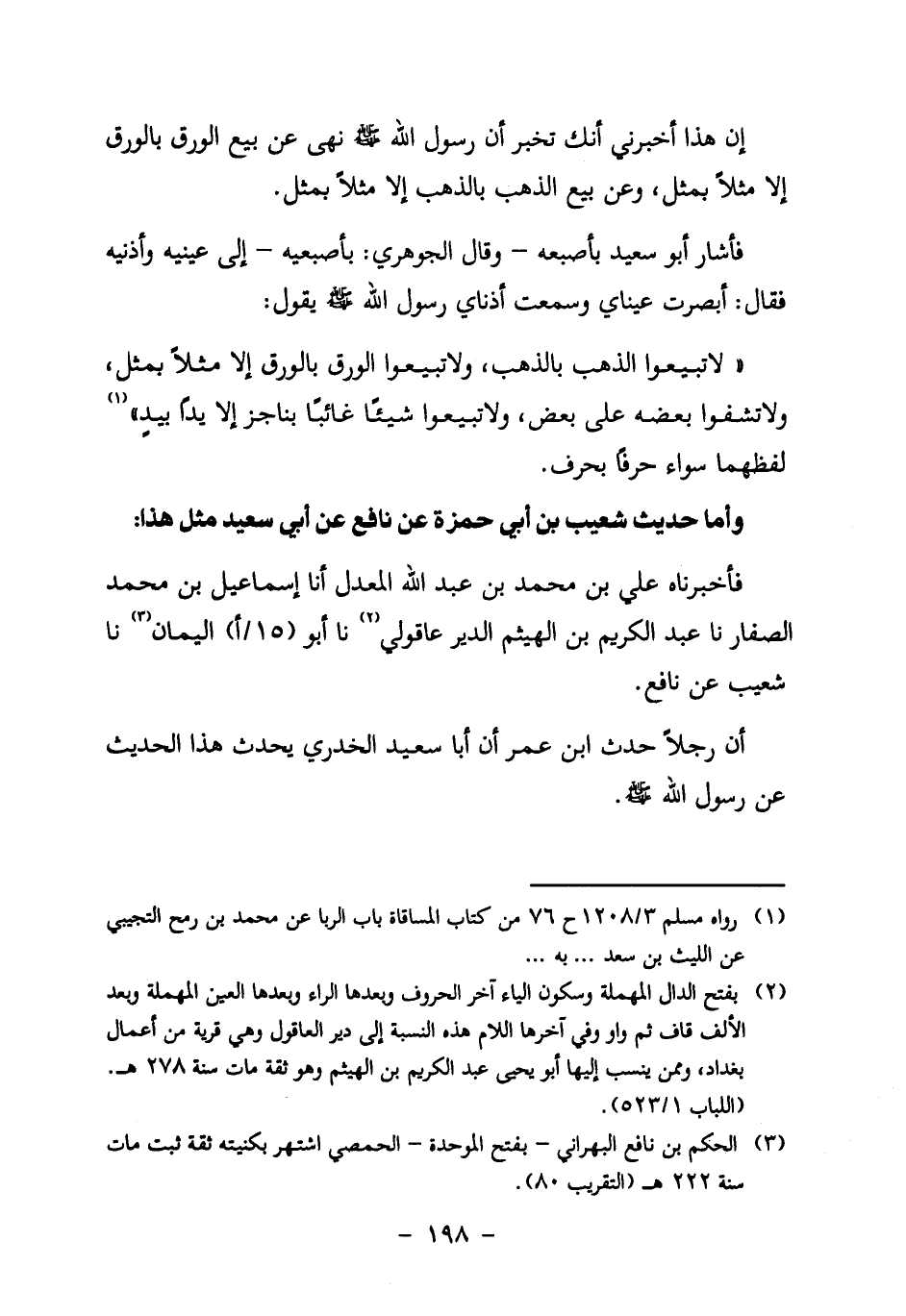 " لا تَبِيعُوا الذَّهَبَ بِالذَّهَبِ، وَلا تَبِيعُوا الْوَرِقَ بِالْوَرِقِ إِلَّا مِثْلًا بِمِثْلٍ، وَلا تَشِفُّوا بَعْضَهُ عَلَى بَعْضٍ، وَلا تَبِيعُوا شَيْئًا غَائِبًا بِنَاجِزٍ إِلَّا يَدًا بِيَدٍ "1.