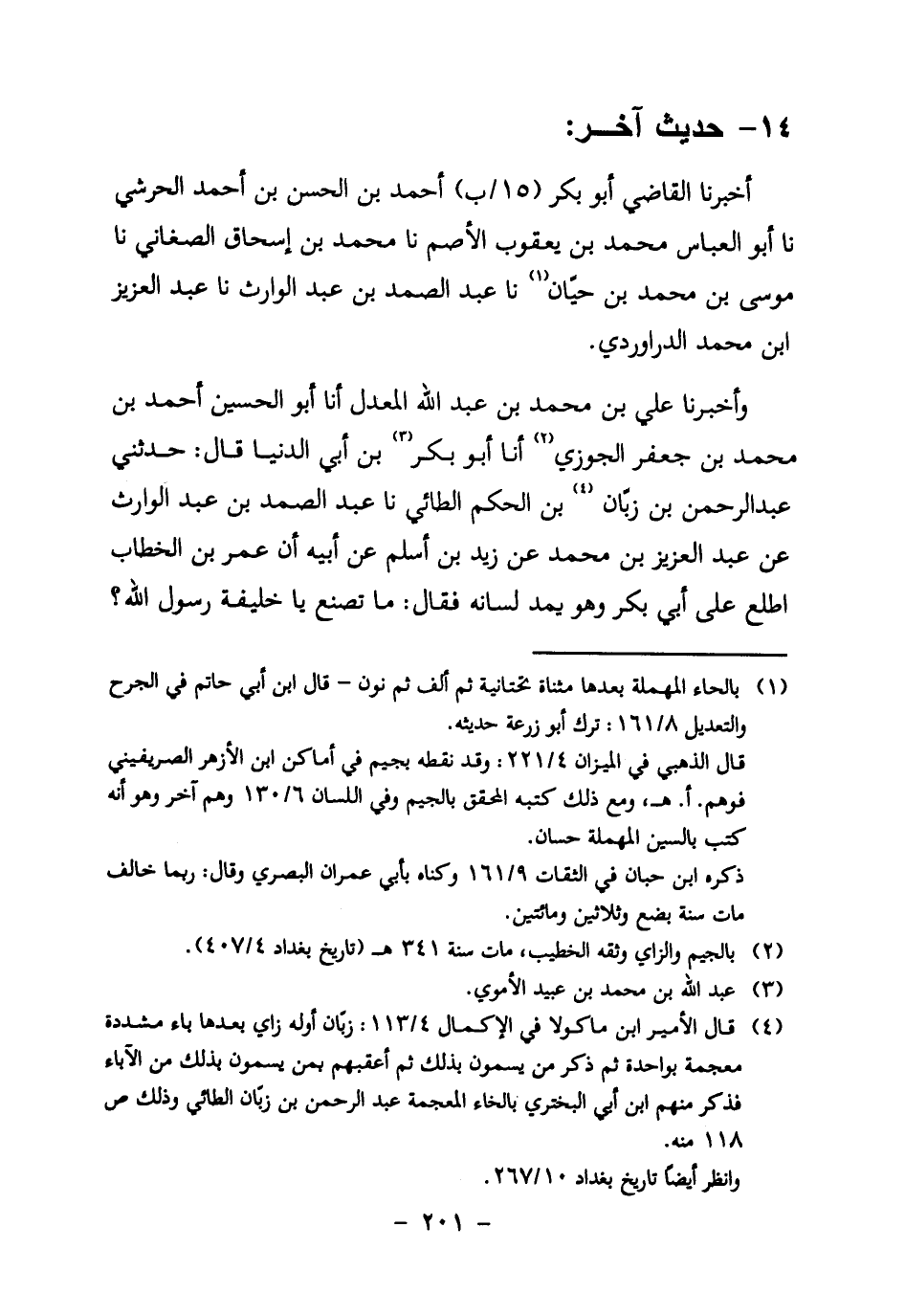 وأخبرنا علي بن محمد بن عبد اللَّهِ الْمُعَدَّلُ أنا أَبُو الْحُسَيْنِ أَحْمَدُ بْنُ مُحَمَّدِ بْنِ جَعْفَرٍ الجوزي2 أنا أَبُو بَكْرِ3 بْنُ أَبِي الدُّنْيَا قَالَ: حَدَّثَنِي عَبْدُ الرَّحْمَنِ بْنُ زَبَّانَ4 بْنِ الْحَكَمِ الطَّائِيُّ نا عبد الصمد بن عبد الوارث عن عبد العزيز بن محمد عن زيد ابن أَسْلَمَ عَنْ أَبِيهِ أَنَّ عُمَرَ بْنَ الْخَطَّابِ اطَّلَعَ عَلَى أَبِي بَكْرٍ وَهُوَ يَمُدُّ لِسَانَهُ فَقَالَ: مَا تَصْنَعُ يَا خَلِيفَةَ رَسُولِ الله؟