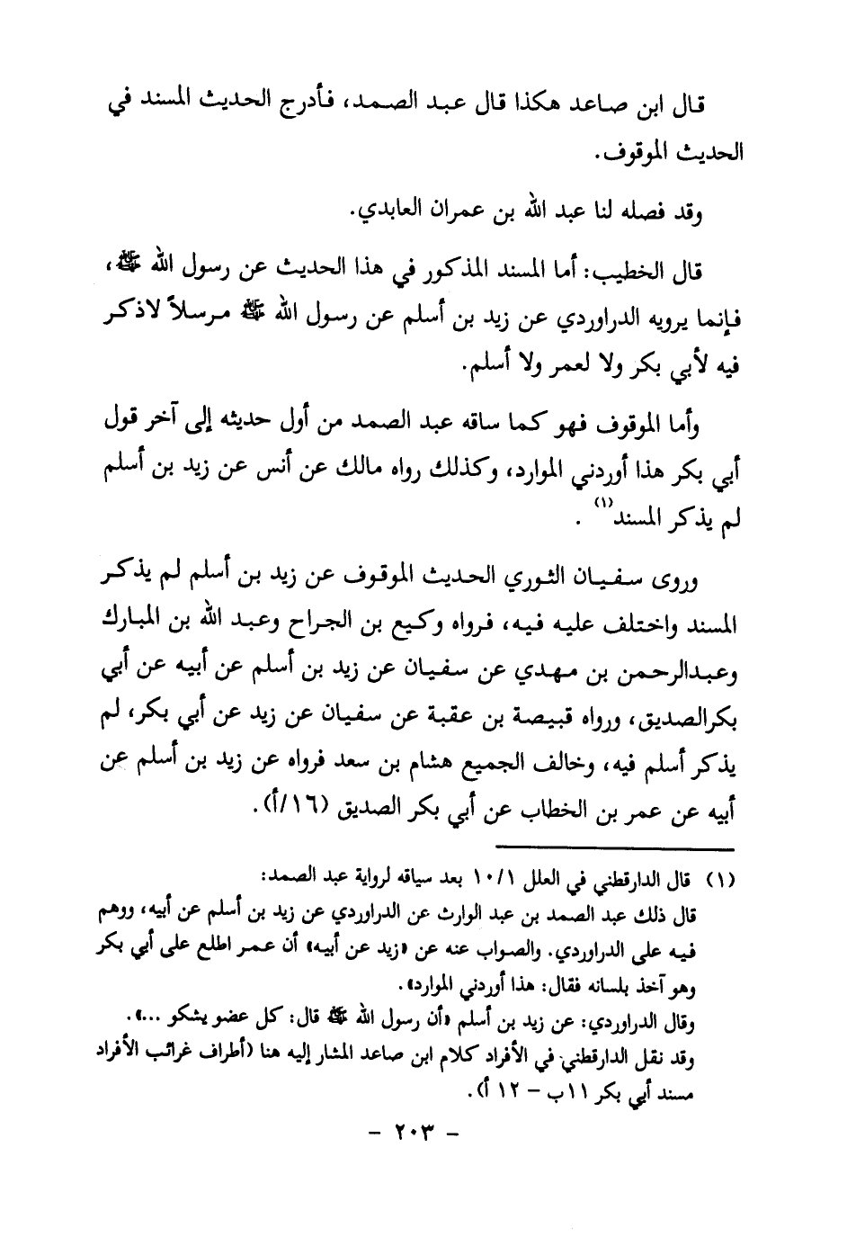 وَرَوَى سُفْيَانُ الثَّوْرِيُّ الْحَدِيثَ الْمَوْقُوفَ عَنْ زَيْدِ بْنِ أَسْلَمَ لَمْ يَذْكُرِ الْمُسْنَدَ وَاخْتُلِفَ عَلَيْهِ فِيهِ، فَرَوَاهُ وَكِيعُ بْنُ الْجَرَّاحِ وَعَبْدُ اللَّهِ بْنُ الْمُبَارَكِ وَعَبْدُ الرَّحْمَنِ بْنُ مَهْدِيٍّ عَنْ سُفْيَانَ عَنْ زَيْدِ بْنِ أَسْلَمَ عَنْ أَبِيهِ عَنْ أَبِي بكر الصديق، ورواه قبيصة ابن عُقْبَةَ عَنْ سُفْيَانَ عَنْ زَيْدٍ عن أبي بكر، لم يذكر أَسْلَمُ فِيهِ، وَخَالَفَ الْجَمِيعَ هِشَامُ بْنُ سَعْدٍ فَرَوَاهُ عَنْ زَيْدِ بْنِ أَسْلَمَ عَنْ أَبِيهِ عَنْ عُمَرَ بْنِ الْخَطَّابِ عَنْ أَبِي بكر الصديق (16/أ) .
