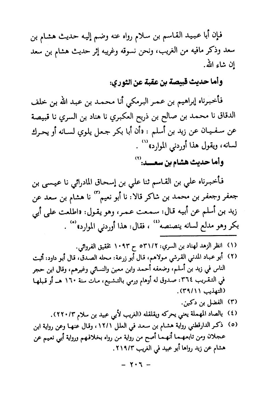 5. ذكر الدارقطني رواية هشام بن سعد في العلل 1/12، وقال عنها وعن رواية ابن عجلان ومن تابعهما أنهما أصح من رواية من رواه بخلافهم ورواية أبي نعيم عن هشام عن زيد رواها أبو عبيد في الغريب 3/219.