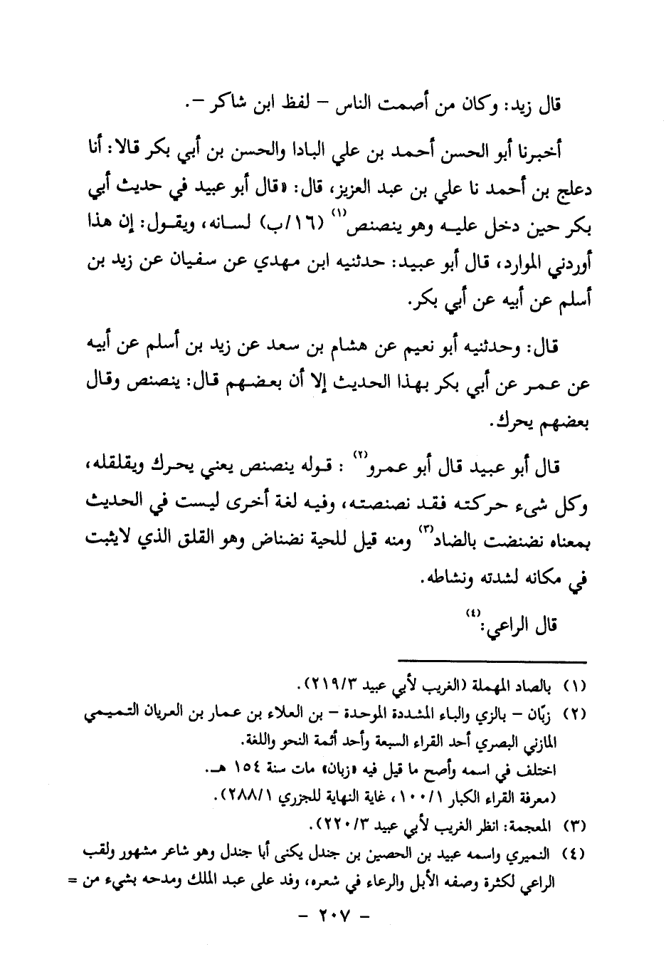 أخبرنا أَبُو الْحَسَنِ أَحْمَدُ بْنُ عَلِيٍّ البادا وَالْحَسَنُ بْنُ أَبِي بَكْرٍ قَالا: أنا دَعْلَجُ بْنُ أَحْمَدَ نا عَلِيُّ بْنُ عَبْدِ الْعَزِيزِ، قَالَ: " قَالَ أَبُو عُبَيْدٍ فِي حَدِيثِ أَبِي بَكْرٍ حِينَ دَخَلَ عَلَيْهِ وهو ينصنص1 (16/ب) لِسَانَهُ، وَيَقُولُ: إِنَّ هَذَا أَوْرَدَنِي الْمَوَارِدَ، قَالَ أَبُو عُبَيْدٍ: حَدَّثَنِيهِ ابْنُ مَهْدِيٍّ عَنْ سُفْيَانَ عَنْ زَيْدِ بْنِ أَسْلَمَ عَنْ أَبِيهِ عَنْ أَبِي بَكْرٍ.