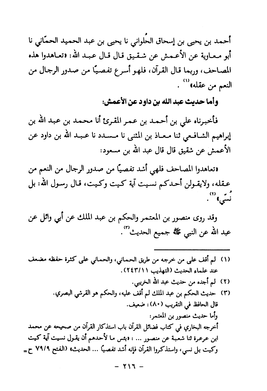 أَحْمَدُ بْنُ يَحْيَى بْنِ إِسْحَاقَ الحُلواني نا يَحْيَى بْنُ عَبْدِ الْحَمِيدِ الْحِمَّانِيُّ نا أَبُو مُعَاوِيَةَ عَنِ الأَعْمَشِ عَنْ شَقِيقٍ قَالَ قَالَ عَبْدُ اللَّهِ: " تَعَاهَدُوا هَذَا الْمَصَاحِفَ، وَرُبَّمَا قَالَ الْقُرْآنَ، فَلَهُوَ أَسْرَعُ تَفَصِّيًا مِنْ صُدُورِ الرِّجَالِ مِنَ النَّعَمِ مِنْ عُقُلِهِ "1.