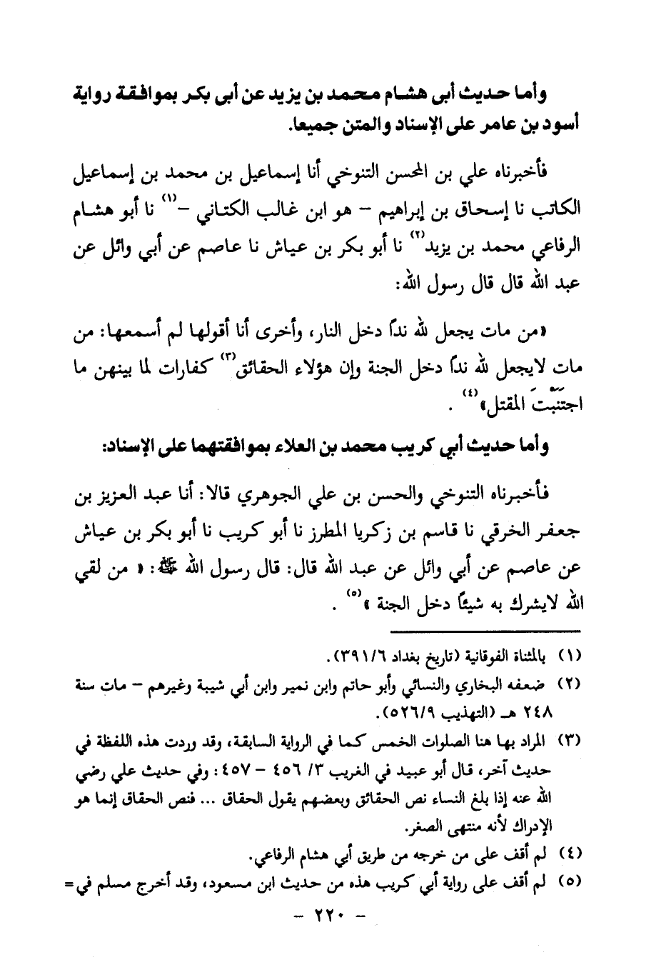 فأخبرناه التَّنُوخِيُّ وَالْحَسَنُ بْنُ عَلِيٍّ الْجَوْهَرِيُّ قَالا: أنا عَبْدُ الْعَزِيزِ بْنُ جَعْفَرٍ الْخِرَقِيُّ نا قَاسِمُ بْنُ زَكَرِيَّا الْمُطَرِّزُ نا أَبُو كُرَيْبٍ نا أَبُو بَكْرِ بْنُ عَيَّاشٍ عَنْ عَاصِمٍ عَنْ أَبِي وَائِلٍ عَنْ عَبْدِ اللَّهِ قَالَ: قَالَ رسول الله صَلَّى اللَّهُ عَلَيْهِ وَسَلَّمَ: " مَنْ لَقِيَ اللَّهُ لا يُشْرِكُ بِهِ شَيْئًا دَخَلَ الْجَنَّةَ " 5.