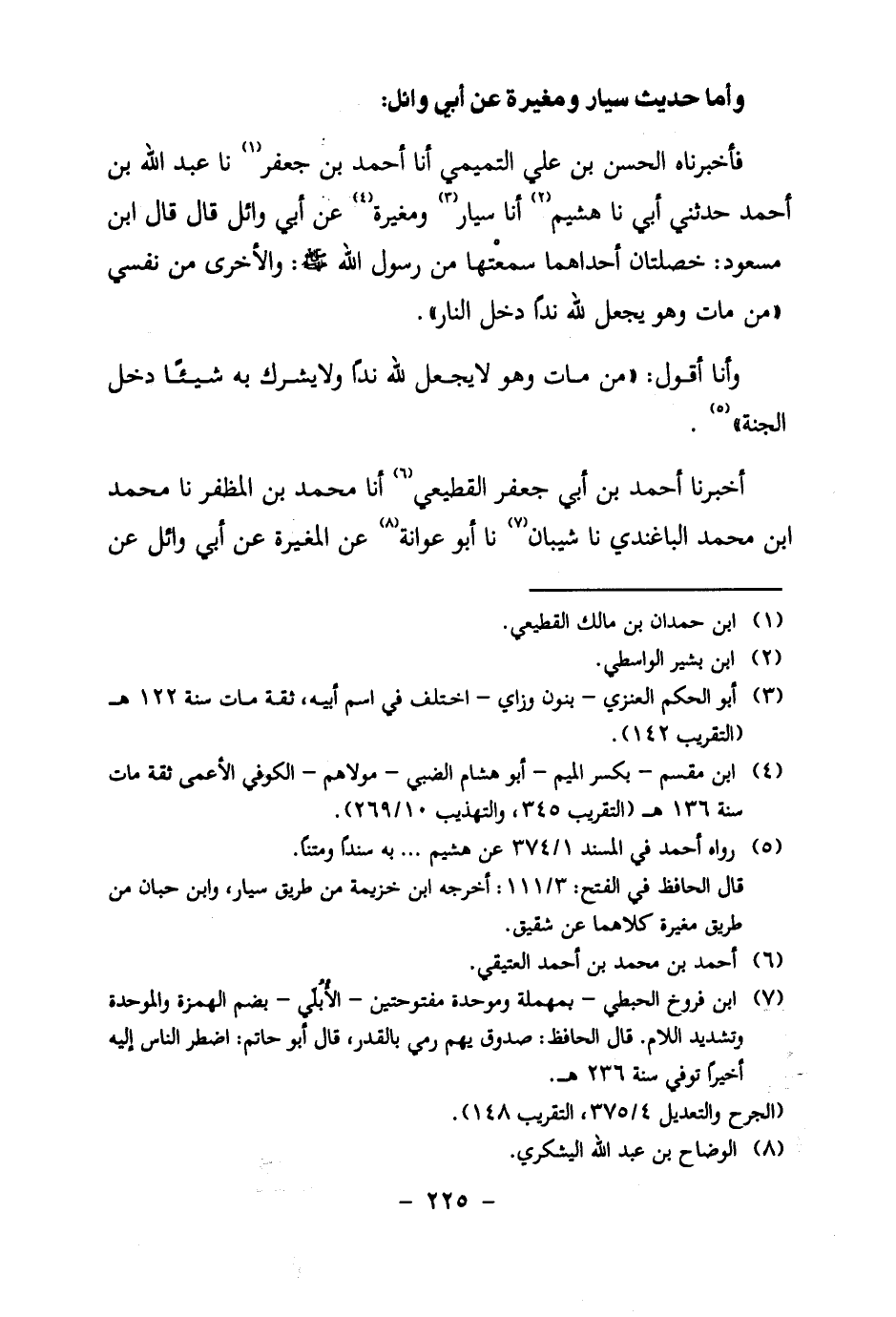 أخبرنا أَحْمَدُ بْنُ أَبِي جَعْفَرٍ الْقَطِيعِيُّ6 أنا مُحَمَّدُ بْنُ الْمُظَفَّرِ نا مُحَمَّدُ بْنُ مُحَمَّدٍ الْبَاغَنْدِيُّ نا شَيْبَانُ7 نا أَبُو عَوَانَةَ8 عَنِ الْمُغِيرَةِ عَنْ أَبِي وَائِلٍ عَنِ