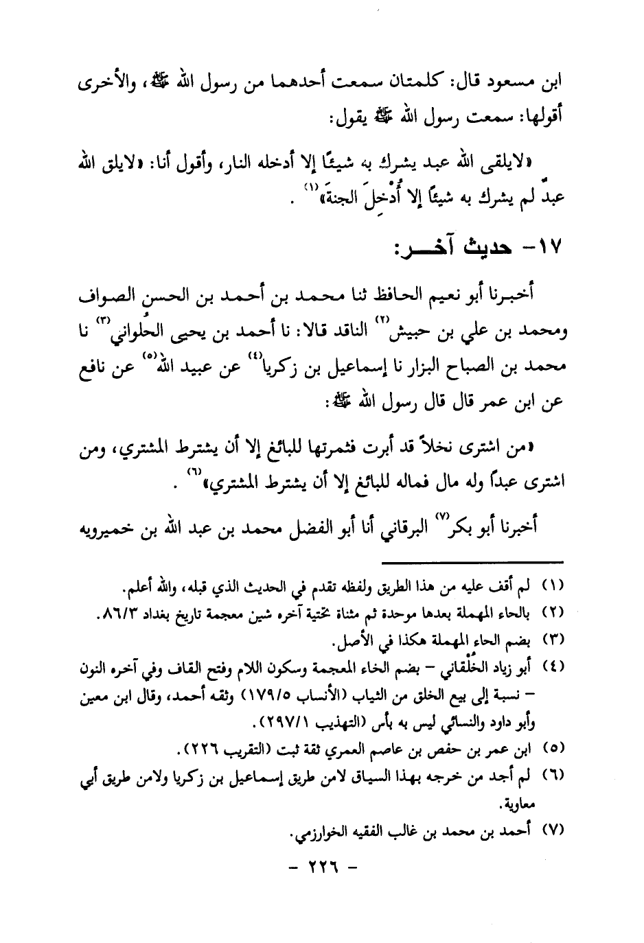 أخبرنا أبو نعيم الحافظ ثنا مُحَمَّدُ بْنُ أَحْمَدَ بْنِ الْحَسَنِ الصَّوَّافُ وَمُحَمَّدُ بْنُ عَلِيِّ بْنِ حُبَيْشٍ2 النَّاقِدُ قَالا: نا أَحْمَدُ بْنُ يَحْيَى الحُلواني3 نا مُحَمَّدُ بن الصباح البزار نا إِسْمَاعِيلُ بْنُ زَكَرِيَّا4 عَنْ عُبَيْدِ اللَّهِ5 عَنْ نَافِعٍ عَنِ ابْنِ عُمَرَ قَالَ: قَالَ رَسُولُ الله صَلَّى اللَّهُ عَلَيْهِ وَسَلَّمَ: