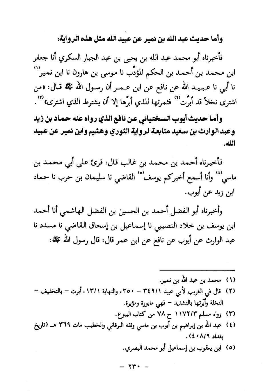 فأخبرناه أَبُو مُحَمَّدٍ عَبْدُ اللَّهِ بْنُ يَحْيَى بْنِ عَبْدِ الْجَبَّارِ السُّكَّرِيُّ أنا جَعْفَرُ بْنُ مُحَمَّدِ بْنِ أَحْمَدَ بْنِ الْحَكَمِ الْمُؤَدِّبُ نا مُوسَى بْنُ هَارُونَ نا ابْنُ نُمَيْرٍ1 نا أَبِي نا عُبَيْدُ اللَّهِ عَنْ نَافِعٍ عَنِ ابْنِ نمير أَنَّ رَسُولَ اللَّهِ صَلَّى اللَّهُ عَلَيْهِ وَسَلَّمَ قَالَ: "مَنِ اشْتَرَى نَخْلًا قَدْ أُبِّرَتْ2 فَثَمَرَتُهَا لِلَّذِي أَبَّرَهَا إِلَّا أَنْ يَشْتَرِطَ الَّذِي اشْتَرَى " 3.