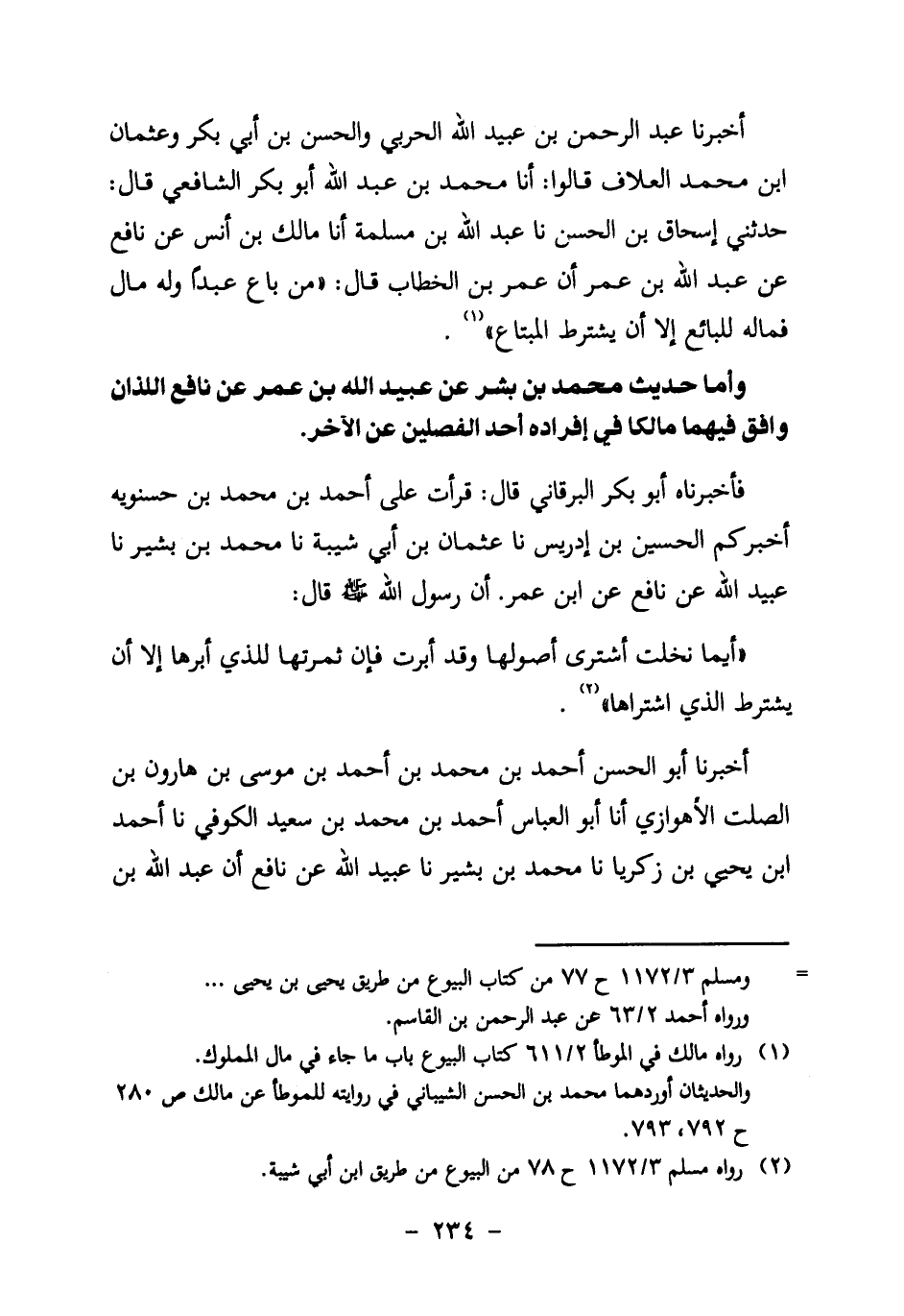 أخبرنا عَبْدُ الرَّحْمَنِ بْنُ عُبَيْدِ اللَّهِ الْحَرْبِيُّ وَالْحَسَنُ بْنُ أَبِي بَكْرٍ وعثمان بن محمد العلاف قَالَ: أَنَا مُحَمَّدُ بْنُ عَبْدِ اللَّهِ أَبُو بَكْرٍ الشَّافِعِيُّ قَالَ: حَدَّثَنِي إِسْحَاقُ بْنُ الْحَسَنِ نا عَبْدُ اللَّهِ بْنُ مَسْلَمَةَ أنا مَالِكِ بْنِ أَنَسٍ عَنْ نَافِعٍ عن عبد الله بن عمر أَنَّ عُمَرَ بْنَ الْخَطَّابِ قَالَ: " مَنْ بَاعَ عَبْدًا وَلَهُ مَالٌ فَمَالُهُ لِلْبَائِعِ إِلَّا أَنْ يَشْتَرِطَ المبتاع "1.