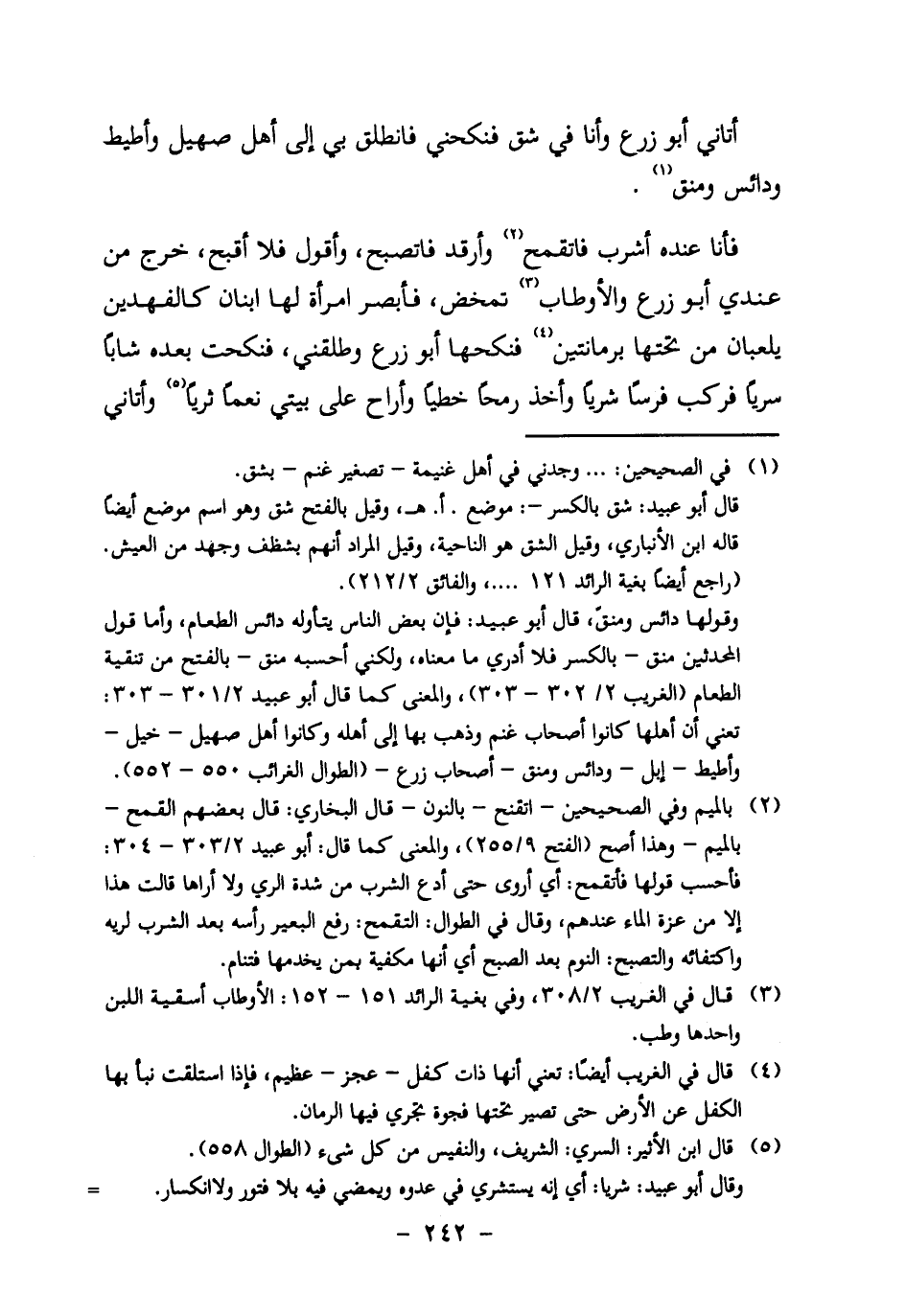 وقولها دائس ومنقّ، قال أبو عبيد: فإن بعض الناس يتأوله دائس الطعام، وأما قول المحدثين منق – بالكسر فلا أدري ما معناه، ولكني أحسبه منق – بالفتح من تنقية الطعام (الغريب 2/302-303) ، والمعنى كما قال أبو عبيد 2/301-303: تعني أن أهلها كانوا أصحاب غنم وذهب بها إلى أهله وكانوا أهل صهيل – خيل – وأطيط – إبل – ودائس ومنق – أصحاب الزرع – (الطوال الغرائب 550-552) .