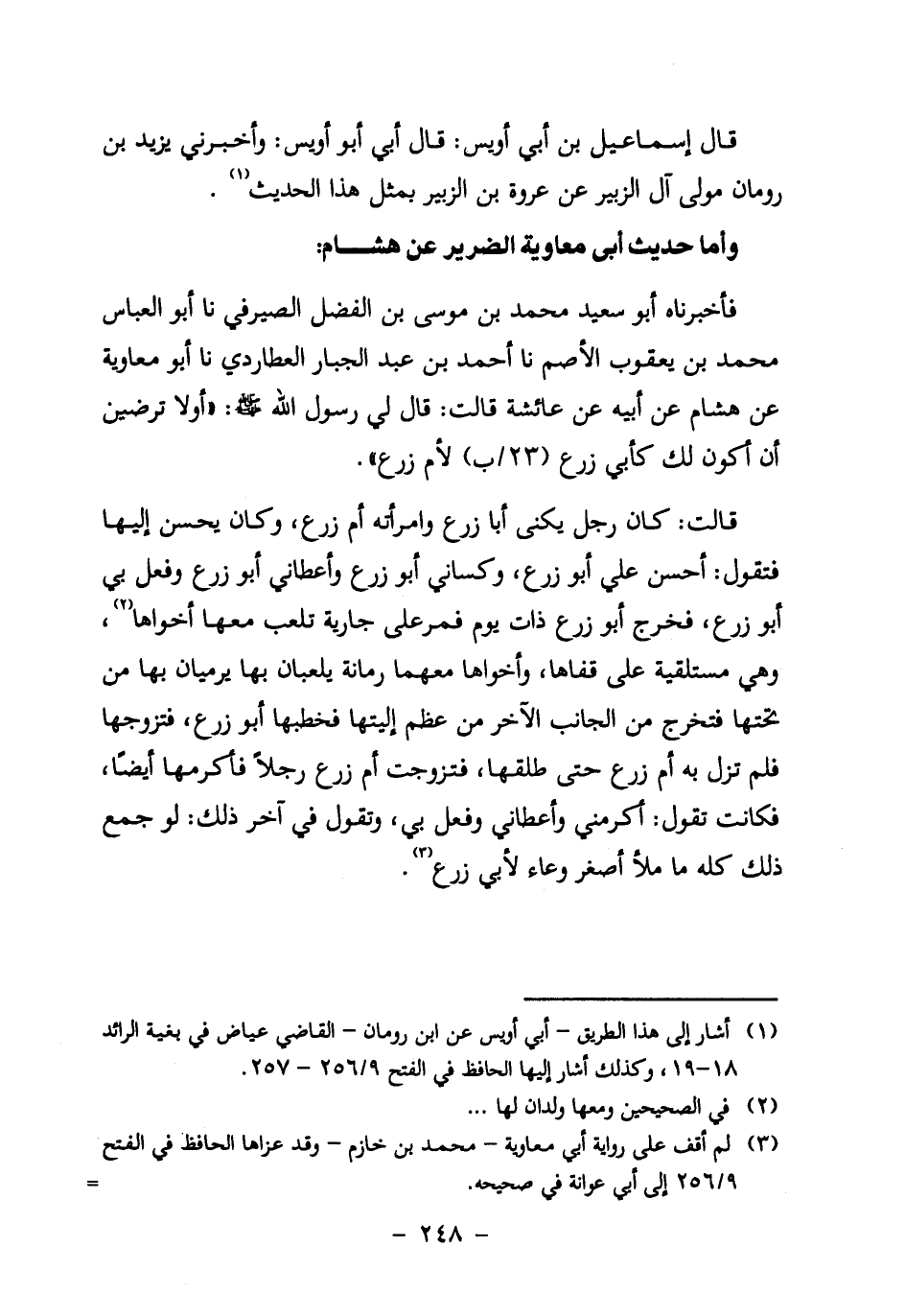فَأَخْبَرَنَاهُ أَبُو سَعِيدٍ مُحَمَّدُ بْنُ مُوسَى بْنِ الْفَضْلِ الصَّيْرَفِيُّ نا أَبُو الْعَبَّاسِ مُحَمَّدُ بْنُ يَعْقُوبَ الأَصَمُّ نا أَحْمَدُ بْنُ عَبْدِ الْجَبَّارِ الْعُطَارِدِيُّ نا أَبُو مُعَاوِيَةَ عَنْ هِشَامٍ عَنْ أَبِيهِ عَنْ عَائِشَةَ قَالَتْ: قَالَ لِي رَسُولُ الله صَلَّى اللَّهُ عَلَيْهِ وَسَلَّمَ:" أولا تَرْضِينَ أَنْ أَكُونَ لَكِ كَأَبِي زرع (23/ب) لأُمِّ زَرْعٍ ".