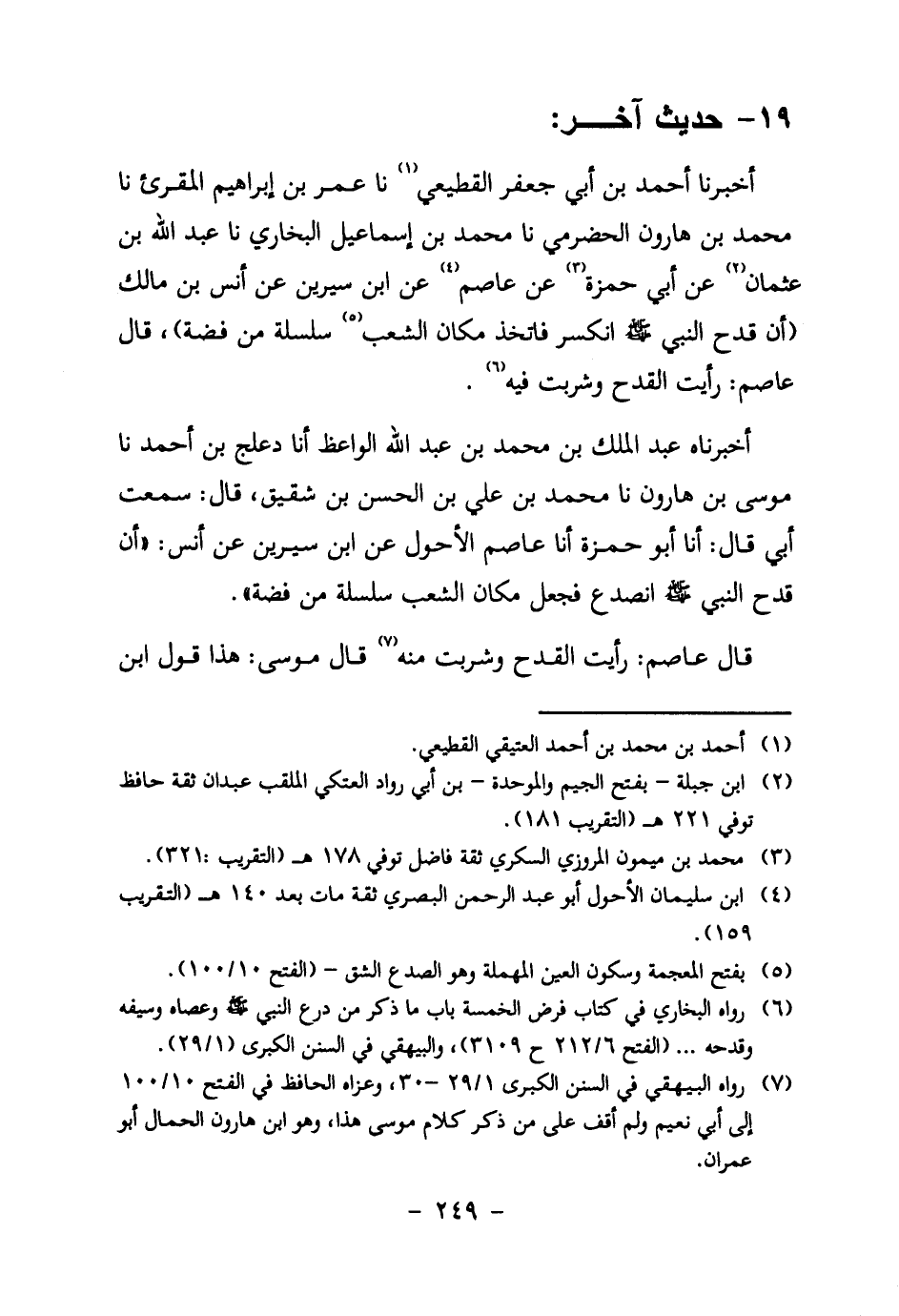 7. رواه البيهقي في السنن الكبرى 1/29 – 30، وعزاه الحافظ في الفتح 10/100 إلى أبي نعيم ولم أقف على من ذكر كلام موسى هذا، وهو ابن هارون الحمال أبو عمران.
