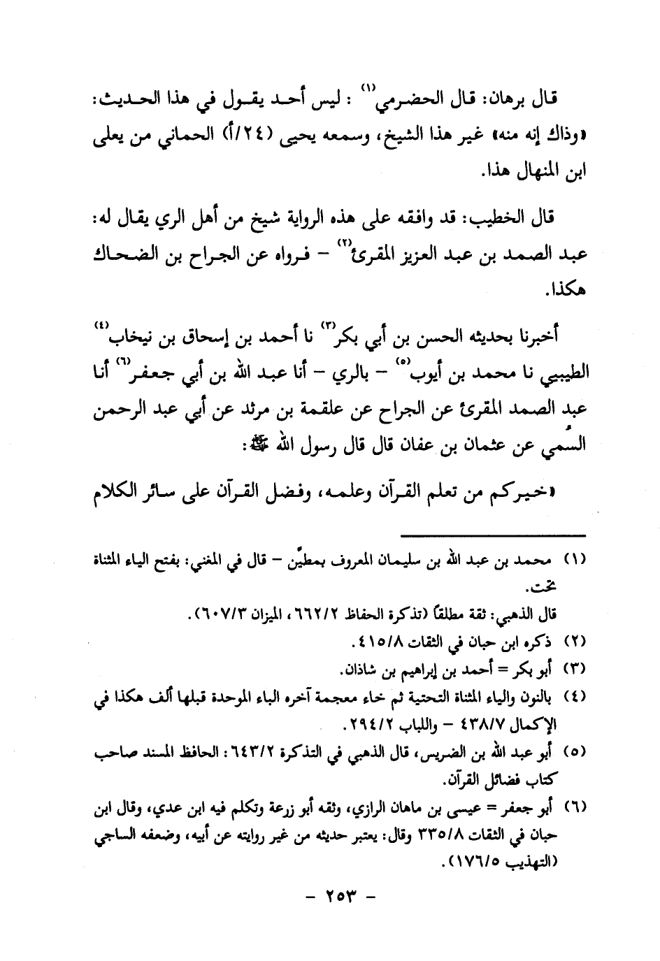 أخبرنا بِحَدِيثِهِ الْحَسَنُ بْنُ أَبِي بَكْرٍ3 نا أَحْمَدُ بْنُ إِسْحَاقَ بْنِ نيخاب4 الطيبيي نا مُحَمَّدُ بْنُ أَيُّوبَ5 - بِالرَّيِّ – أنا عبد الله ابن أَبِي جَعْفَرٍ6 أنا عَبْدُ الصَّمَدِ الْمُقْرِئُ عَنِ الْجَرَّاحِ عَنْ عَلْقَمَةَ بْنِ مَرْثَدٍ عَنْ أَبِي عَبْدِ الرحمن السمي عَنْ عُثْمَانَ بْنِ عَفَّانَ قَالَ قَالَ رَسُولُ اللَّهِ صَلَّى اللَّهُ عَلَيْهِ وَسَلَّمَ"