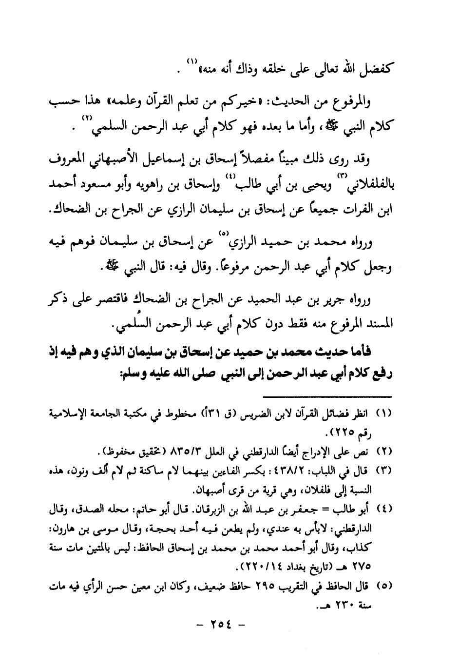 وَالْمَرْفُوعُ مِنَ الْحَدِيثِ: " خَيْرُكُمْ مَنْ تَعَلَّمَ الْقُرْآنَ وَعَلَّمَهُ " هَذَا حَسْبُ كَلامُ النَّبِيِّ صَلَّى اللَّهُ عَلَيْهِ وَسَلَّمَ، وأما مَا بَعْدَهُ فَهُوَ كَلامُ أَبِي عَبْدِ الرَّحْمَنِ السُّلَمِيِّ2.