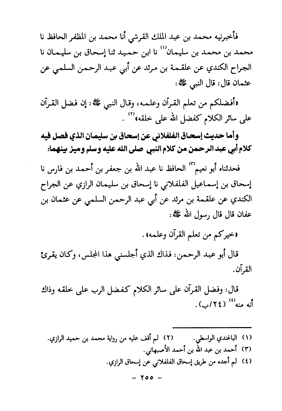 فَحَدَّثَنَاهُ أَبُو نُعَيْمٍ3 الحافظ نا عبد الله بن جَعْفَرِ بْنِ أَحْمَدَ بْنِ فَارِسٍ نا إِسْحَاقُ بْنُ إِسْمَاعِيلَ الْفِلْفِلانِيُّ نا إِسْحَاقُ بْنُ سُلَيْمَانَ الرَّازِيُّ عَنِ الْجَرَّاحِ الْكِنْدِيِّ عَنْ عَلْقَمَةَ بْنِ مَرْثَدٍ عَنْ أَبِي عَبْدِ الرَّحْمَنِ السُّلَمِيِّ عَنْ عُثْمَانَ بْنِ عَفَّانَ قَالَ قَالَ رَسُولُ اللَّهِ صَلَّى اللَّهُ عَلَيْهِ وَسَلَّمَ: