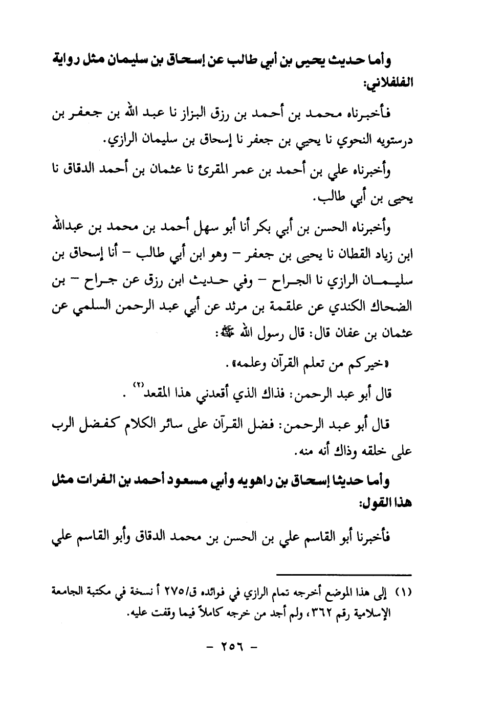 وَأَخْبَرَنَا الْحَسَنُ بْنُ أَبِي بَكْرٍ أنا أَبُو سَهْلٍ أَحْمَدُ بْنُ محمد بن عبد الله بن زِيَادٍ الْقَطَّانُ نا يَحْيَى بْنُ جَعْفَرٍ – وَهُوَ ابْنُ أَبِي طَالِبٍ – أنا إِسْحَاقُ بْنُ سُلَيْمَانَ الرَّازِيُّ نا الْجَرَّاحُ – وَفِي حَدِيثِ ابْنِ رِزْقٍ عَنْ جَرَّاحِ – بْنِ الضَّحَّاكِ الْكِنْدِيِّ عَنْ عَلْقَمَةَ بْنِ مَرْثَدٍ عَنْ أَبِي عَبْدِ الرَّحْمَنِ السُّلَمِيِّ عَنْ عُثْمَانَ بْنِ عَفَّانَ قَالَ: قَالَ رَسُولُ اللَّهِ صَلَّى اللَّهُ عَلَيْهِ وَسَلَّمَ: