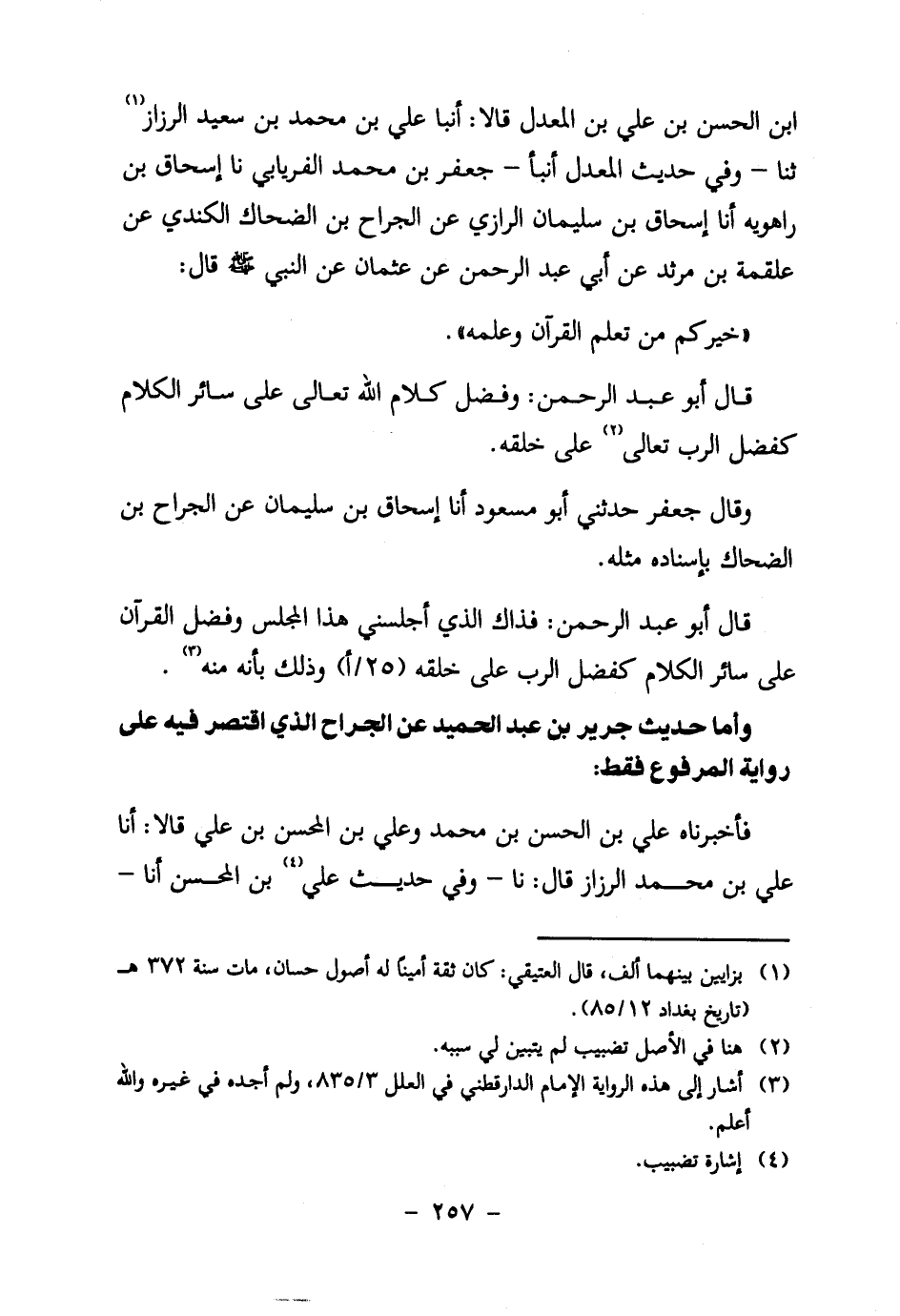 ابن الْحَسَنِ بْنِ عَلِيٍّ الْمُعَدَّلُ قَالا: أنبا عَلِيُّ بْنُ مُحَمَّدِ بْنِ سَعِيدٍ الرازا1 ثنا – وَفِي حَدِيثِ الْمُعَدَّلِ أنبأ – جعفر بن محمد الفريابي نا إِسْحَاقُ بْنُ رَاهَوَيْهِ أنا إِسْحَاقُ بْنُ سُلَيْمَانَ الرَّازِيُّ عَنِ الْجَرَّاحِ بْنِ الضَّحَّاكِ الْكِنْدِيِّ عَنْ عَلْقَمَةَ بْنِ مَرْثَدٍ عَنْ أَبِي عَبْدِ الرَّحْمَنِ عَنْ عُثْمَانَ عَنِ النَّبِيِّ صَلَّى اللَّهُ عَلَيْهِ وَسَلَّمَ قَالَ: