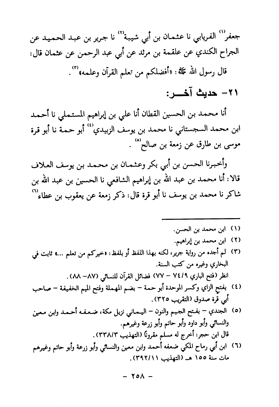 جَعْفَرٌ1 الْفِرْيَابِيُّ نا عُثْمَانُ بْنُ أَبِي شَيْبَةَ2 نا جَرِيرُ بْنُ عبد الحميد عَنِ الْجَرَّاحِ الْكِنْدِيِّ عَنْ عَلْقَمَةَ بْنِ مَرْثَدٍ عَنْ أَبِي عَبْدِ الرَّحْمَنِ عَنْ عُثْمَانَ قَالَ: قَالَ رسول الله صَلَّى اللَّهُ عَلَيْهِ وَسَلَّمَ: " أَفْضَلُكُمْ مَنْ تَعَلَّمَ الْقُرْآنَ وَعَلَّمَهُ " 3.