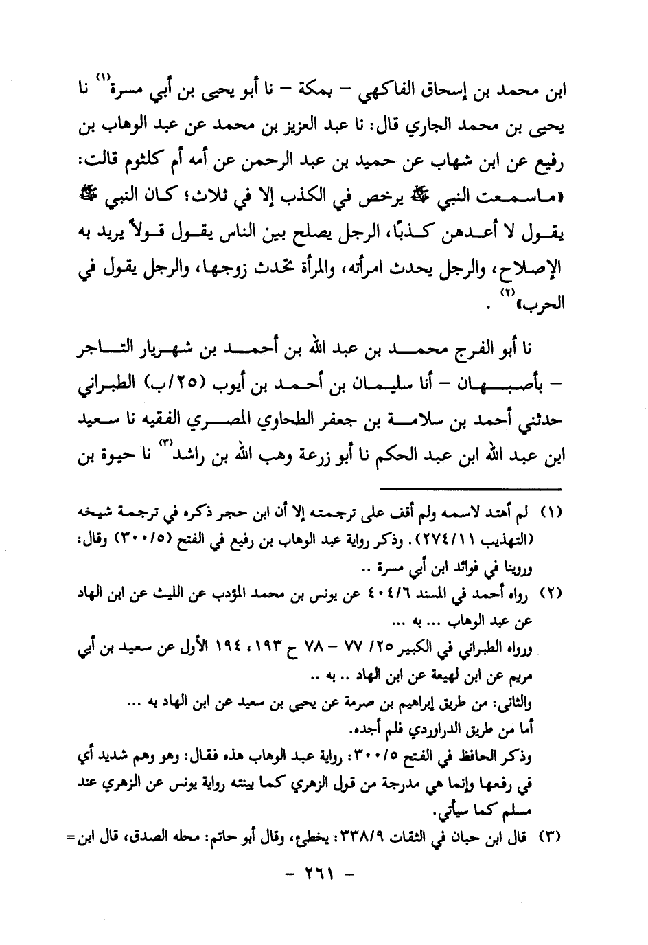 ابن مُحَمَّدِ بْنِ إِسْحَاقَ الْفَاكِهِيُّ – بِمَكَّةَ – نا أبو يحيى ابن أبي مسرة1 نا يَحْيَى بْنُ مُحَمَّدٍ الْجَارِي قَالَ: نا عَبْدُ الْعَزِيزِ بْنُ مُحَمَّدٍ عَنْ عَبْدِ الْوَهَّابِ بْنِ رُفَيْعٍ عَنِ ابْنِ شِهَابٍ عَنْ حُمَيْدِ بْنِ عَبْدِ الرَّحْمَنِ عَنْ أُمِّهِ أُمِّ كُلْثُومٍ قَالَتْ: " مَا سَمِعْتُ النَّبِيَّ صَلَّى اللَّهُ عَلَيْهِ وَسَلَّمَ يُرَخِّصُ فِي الْكَذِبِ إِلَّا فِي ثَلاثٍ؛ كَانَ النَّبِيُّ صَلَّى اللَّهُ عَلَيْهِ وَسَلَّمَ يَقُولُ لا أَعُدُّهُنَّ كَذِبًا، الرَّجُلُ يُصْلِحُ بَيْنَ النَّاسِ يَقُولُ قَوْلًا يُرِيدُ بِهِ الإصلاح، وَالرَّجُلُ يُحَدِّثُ امْرَأَتَهُ، وَالْمَرْأَةُ تُحَدِّثُ زَوْجَهَا، وَالرَّجُلُ يَقُولُ فِي الْحَرْبِ " 2.