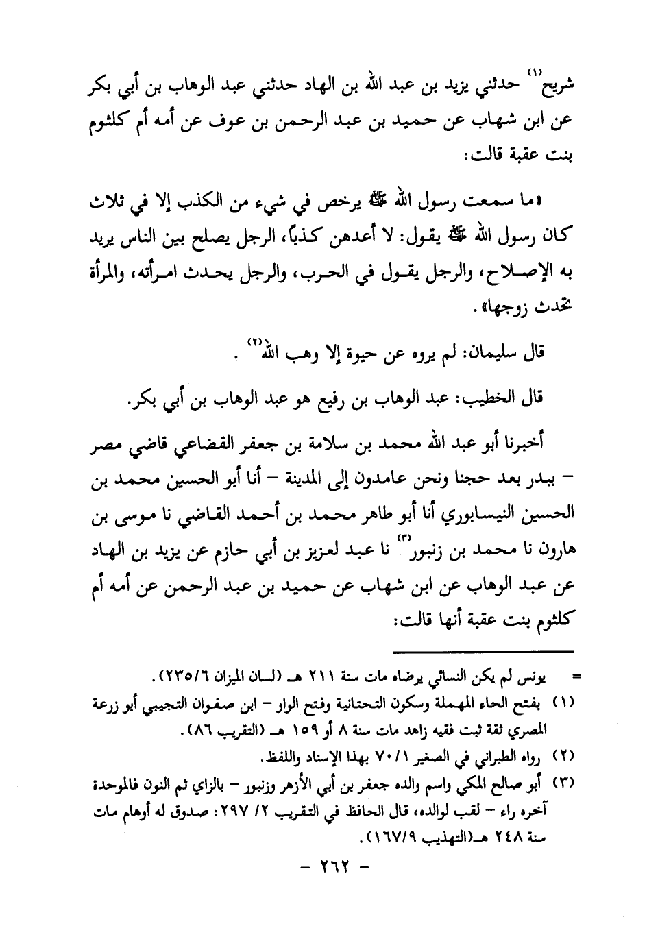 أَخْبَرَنَا أَبُو عَبْدِ اللَّهِ مُحَمَّدُ بْنُ سَلامَةَ بْنِ جَعْفَرٍ الْقُضَاعِيُّ قَاضِي مِصْرَ – ببدر بعد حجنا ونحن عامدون إلى المدينة – أنا أبو الْحُسَيْنِ النَّيْسَابُورِيُّ أنا أَبُو طَاهِرٍ مُحَمَّدُ بْنُ أَحْمَدَ الْقَاضِي نا مُوسَى بْنُ هَارُونَ نا مُحَمَّدُ بْنُ زُنْبُورٍ3 نا عَبْدُ الْعَزِيزِ بْنُ أَبِي حَازِمٍ عَنْ يَزِيدَ بْنِ الْهَادِ عَنْ عَبْدِ الْوَهَّابِ عَنِ ابْنِ شِهَابٍ عَنْ حُمَيْدِ بْنِ عَبْدِ الرَّحْمَنِ عَنْ أُمِّهِ أُمِّ كُلْثُومٍ بِنْتِ عُقْبَةَ أَنَّهَا قالت: