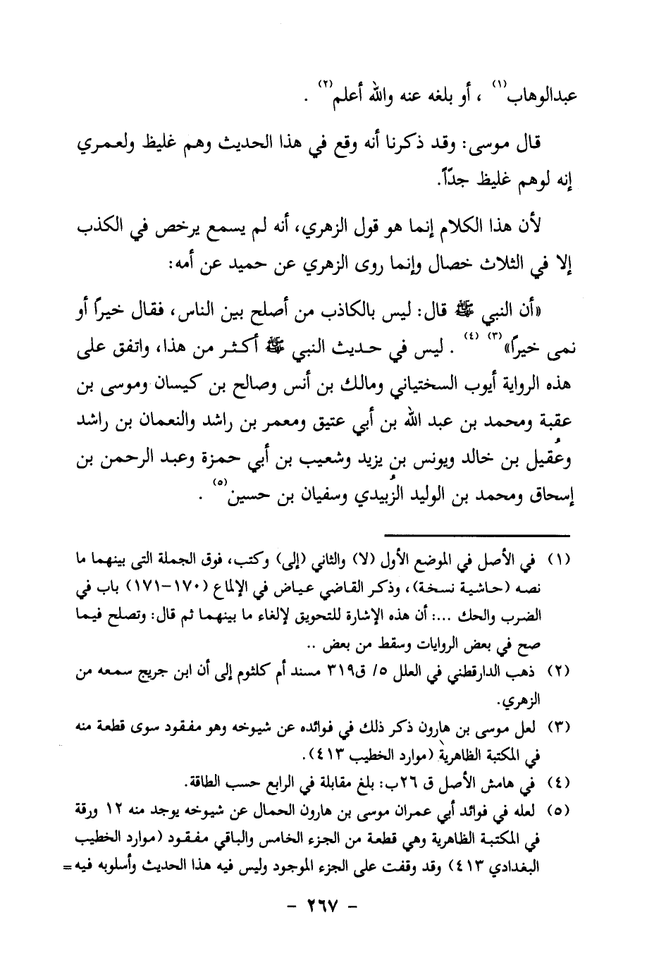 " أَنَّ النَّبِيَّ صَلَّى الله عبيه وَسَلَّمَ قَالَ: " لَيْسَ بِالْكَاذِبِ مَنْ أَصْلَحَ بَيْنَ النَّاسِ، فَقَالَ خَيْرًا أَوْ نَمَى خَيْرًا " 3 4. لَيْسَ فِي حَدِيثِ النَّبِيِّ صَلَّى اللَّهُ عَلَيْهِ وَسَلَّمَ أَكْثَرُ مِنْ هَذَا، وَاتَّفَقَ عَلَى هَذِهِ الرِّوَايَةِ أَيُّوبُ السَّخْتِيَانِيُّ وَمَالِكُ بْنُ أَنَسٍ وَصَالِحُ بْنُ كَيْسَانَ وَمُوسَى بْنُ عُقْبَةَ وَمُحَمَّدُ بْنُ عَبْدِ اللَّهِ بْنِ أَبِي عَتِيقٍ وَمَعْمَرُ بْنُ رَاشِدٍ وَالنُّعْمَانُ بْنُ رَاشِدٍ وَعُقَيْلُ بْنُ خَالِدٍ ويونس ابن يَزِيدَ وَشُعَيْبُ بْنُ أَبِي حَمْزَةَ وَعَبْدُ الرَّحْمَنِ بْنُ إِسْحَاقَ وَمُحَمَّدُ بْنُ الْوَلِيدِ الزُّبَيْدِيُّ وَسُفْيَانُ بْنُ حسين5.