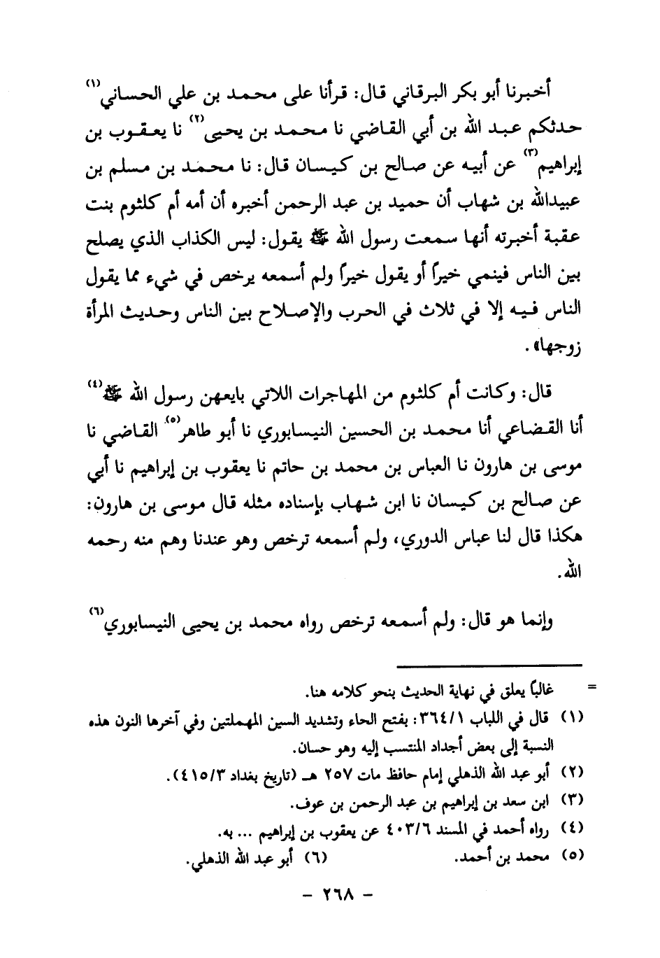أَخْبَرَنَا أَبُو بَكْرٍ الْبَرْقَانِيُّ قَالَ: قَرَأْنَا عَلَى مُحَمَّدِ بْنِ عَلِيٍّ الْحَسَّانِيِّ1 حَدَّثَكُمْ عَبْدُ اللَّهِ بْنُ أَبِي الْقَاضِي نا مُحَمَّدُ بْنُ يَحْيَى2 نا يَعْقُوبُ بْنُ إِبْرَاهِيمَ3 عَنْ أَبِيهِ عَنْ صَالِحِ بْنِ كَيْسَانَ قَالَ: نا مُحَمَّدُ بْنُ مُسْلِمِ بْنِ عُبَيْدِ اللَّهِ بْنِ شهاب أن أحميد بْنَ عَبْدِ الرَّحْمَنِ أَخْبَرَهُ أَنَّ أُمِّهِ أُمِّ كُلْثُومٍ بِنْتِ عُقْبَةَ أَخْبَرَتْهُ أَنَّهَا سَمِعَتْ رَسُولَ اللَّهِ صَلَّى اللَّهُ عَلَيْهِ وَسَلَّمَ يَقُولُ: " لَيْسَ الْكَذَّابُ الَّذِي يُصْلِحُ بَيْنَ النَّاسِ فَيَنْمِي خَيْرًا أَوْ يَقُولُ خَيْرًا وَلَمْ أَسْمَعْهُ يُرَخِّصُ فِي شَيْءٍ مِمَّا يَقُولُ النَّاسُ فِيهِ إِلَّا فِي ثَلاثٍ فِي الْحَرْبِ وَالإِصْلاحِ بَيْنَ النَّاسِ وَحَدِيثُ الْمَرْأَةِ زَوْجَهَا ".