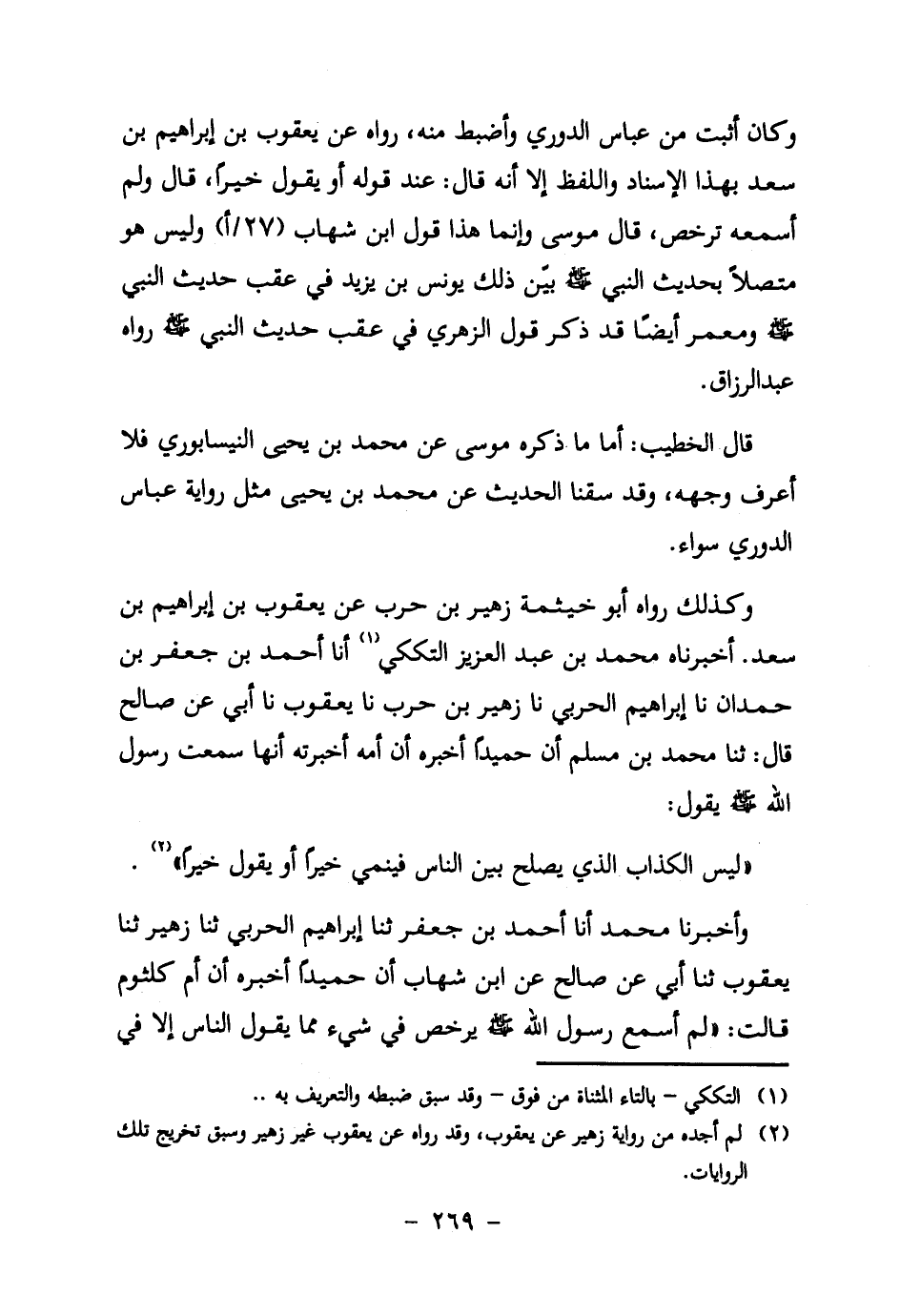 وأخبرنا محمد أنا أحمد بن جعفر ثنا إبراهيم الحربي ثنا زهير ثنا يعقوب ثنا أَبِي عَنْ صَالِحٍ عَنِ ابْنِ شهاب أن حميدا أخبره أن أُمَّ كُلْثُومٍ قَالَتْ: " لَمْ أَسْمَعْ رسول الله صَلَّى اللَّهُ عَلَيْهِ وَسَلَّمَ يُرَخِّصُ فِي شَيْءٍ مِمَّا يقول الناس إلا في