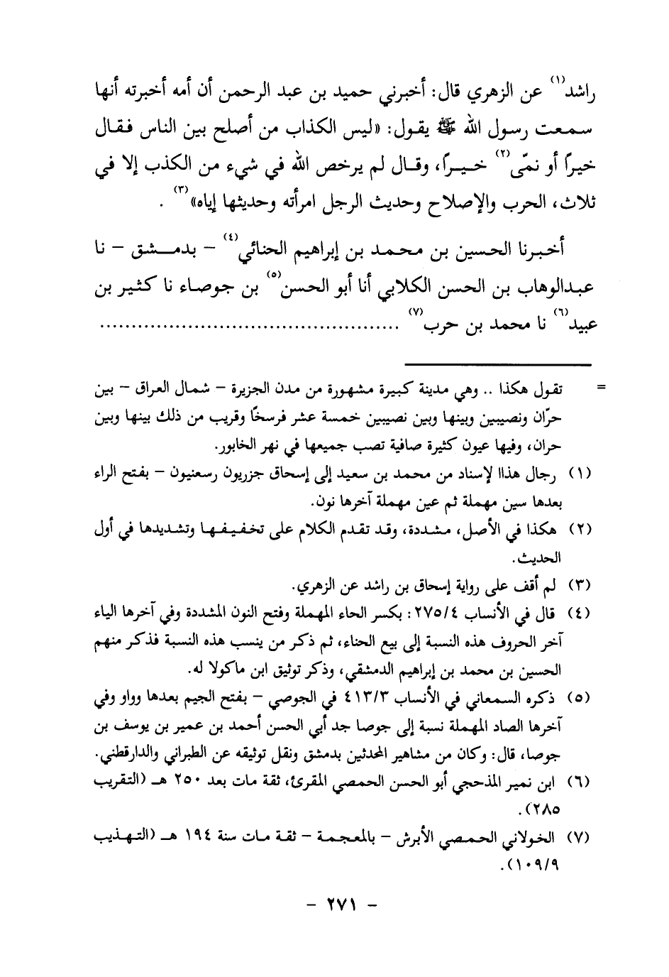 رَاشِدٍ1 عَنِ الزُّهْرِيِّ قَالَ: أَخْبَرَنِي حُمَيْدُ بْنُ عَبْدِ الرَّحْمَنِ أَنَّ أُمَّهُ أَخْبَرَتْهُ أَنَّهَا سَمِعَتْ رَسُولَ الله صَلَّى اللَّهُ عَلَيْهِ وَسَلَّمَ يَقُولُ: " لَيْسَ الْكَذَّابُ مَنْ أَصْلَحَ بَيْنَ النَّاسِ فَقَالَ خَيْرًا أَوْ نَمَى2 خَيْرًا، وَقَالَ لَمْ يُرَخِّصِ اللَّهُ فِي شَيْءٍ مِنَ الْكَذِبِ إِلَّا فِي ثَلاثٍ، الْحَرْبِ وَالإِصْلاحِ وَحَدِيثِ الرَّجُلِ امْرَأَتَهُ وَحَدِيثِهَا إِيَّاهُ " 3.