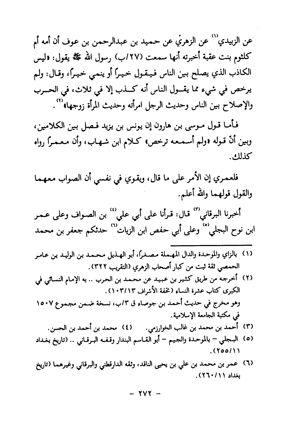 عَنِ الزُّبَيْدِيِّ1 عَنِ الزُّهْرِيِّ عَنْ حُمَيْدِ بْنِ عَبْدِ الرَّحْمَنِ بْنِ عَوْفٍ أَنَّ أُمَّهُ أُمَّ كُلْثُومٍ بِنْتَ عُقْبَةَ أَخْبَرَتْهُ أَنَّهَا سَمِعَتْ (27/ب) رسول الله صَلَّى اللَّهُ عَلَيْهِ وَسَلَّمَ يَقُولُ: " لَيْسَ الْكَاذِبُ الَّذِي يُصْلِحُ بَيْنَ النَّاسِ فَيَقُولُ خَيْرًا أَوْ يَنْمِي خَيْرًا، وَقَالَ: وَلَمْ يُرَخِّصُ فِي شَيْءٍ مِمَّا يَقُولُ النَّاسُ أَنَّهُ كَذِبٌ إِلَّا فِي ثَلاثٍ؛ فِي الْحَرْبِ وَالإِصْلاحِ بَيْنَ النَّاسِ وَحَدِيثِ الرَّجُلِ امْرَأَتَهُ وَحَدِيثِ الْمَرْأَةِ زَوْجَهَا " 2.