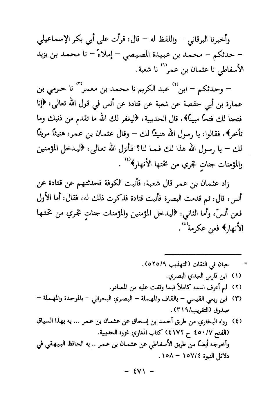 - وَحَدَّثَكُمُ - ابْنُ2 عَبْدِ الْكَرِيمِ نَا مُحَمَّدُ بْنُ مَعْمَرٍ3 نَا حَرَمِيُّ بْنُ عُمَارَة بن أَبِي حَفْصَةَ عَنْ شُعْبَةَ عَنْ قَتَادَةَ عَنْ أَنَسٍ فِي قَوْلِ اللَّهِ تَعَالَى: {إِنَّا فَتَحْنَا لَكَ فَتْحاً مُبِيناً} ، قَالَ الْحُدَيْبِيَةُ، {لِيَغْفِرَ لَكَ اللَّهُ مَا تَقَدَّمَ مِنْ ذَنْبِكَ وَمَا تَأَخَّرَ} ، فَقَالُوا: يَا رَسُولَ اللَّهِ هَنِيئًا لَكَ – وَقَالَ عُثْمَانُ بْنُ عُمَرَ: هَنِيئًا مَرِيئًا لَكَ – يَا رَسُولَ اللَّهِ هَذَا لَكَ فَمَا لَنَا؟ فَأَنْزَلَ اللَّهُ تَعَالَى: {لِيُدْخِلَ الْمُؤْمِنِينَ وَالْمُؤْمِنَاتِ جَنَّاتٍ تَجْرِي مِنْ تَحْتِهَا الْأَنْهَارُ} 4.