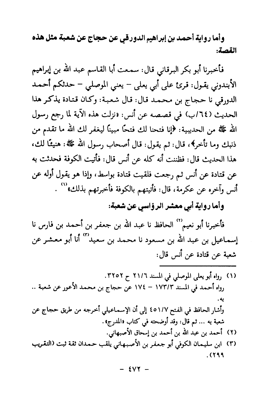 فأخبرنا أَبُو بَكْرٍ الْبَرْقَانِيُّ قَالَ: سَمِعْتُ أَبَا الْقَاسِمِ عَبْدَ اللَّهِ بْنَ إِبْرَاهِيمَ الآبَنْدُونِيُّ يَقُولُ: قُرِئَ عَلَى أَبِي يَعْلَى – يَعْنِي الْمَوْصِلِيَّ – حَدَّثَكُمْ أَحْمَدُ الدَّوْرَقِيُّ نَا حَجَّاجُ بْنُ مُحَمَّدٍ قَالَ: قَالَ شُعْبَةُ: وَكَانَ قتادة يذكر الحديث (64/ب) فِي قَصَصِهِ عَنْ أَنَسٍ: " نَزَلَتْ هَذِهِ الآيَةُ لَمَّا رَجَعَ رَسُولُ الله صَلَّى اللَّهُ عَلَيْهِ وَسَلَّمَ مِنَ الْحُدَيْبِيَةِ: {إِنَّا فَتَحْنَا لَكَ فَتْحاً مُبِيناً لِيَغْفِرَ لَكَ اللَّهُ مَا تَقَدَّمَ مِنْ ذَنْبِكَ وَمَا تَأَخَّرَ} ، قَالَ: ثُمَّ يَقُولُ: قَالَ أَصْحَابُ رسول الله صَلَّى اللَّهُ عَلَيْهِ وَسَلَّمَ: هَنِيئًا لَكَ، هَذَا الْحَدِيثَ قَالَ: فَظَنَنْتُ أَنَّهُ كُلَّهُ عَنْ أَنَسٍ قَالَ: فَأَتَيْتُ الْكُوفَةَ فَحَدَّثْتُ بِهِ عَنْ قَتَادَةَ عَنْ أَنَسٍ ثُمَّ رَجَعْتُ فَلَقِيتُ قَتَادَةَ بِوَاسِطَ، وَإِذَا هُوَ يَقُولُ أَوَّلَهُ عَنْ أَنَسٍ وَآخِرَهُ عَنْ عِكْرِمَةَ، قَالَ: فَأَتَيْتُهُمْ بِالْكُوفَةِ فَأَخْبَرْتُهُمْ بِذَلِكَ "1.