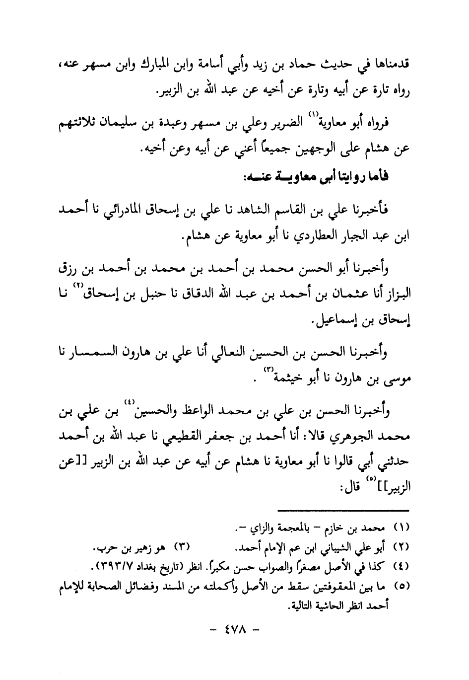 وأخبرنا الْحَسَنُ بْنُ عَلِيِّ بْنِ مُحَمَّدٍ الواعظ والحسين4 بْنُ عَلِيِّ بْنِ مُحَمَّدٍ الْجَوْهَرِيُّ قَالا: أَنَا أَحْمَدُ بْنُ جَعْفَرٍ الْقَطِيعِيُّ نا عَبْدُ اللَّهِ بْنُ أَحْمَدَ حَدَّثَنِي أَبِي قَالُوا نَا أَبُو مُعَاوِيَةَ نَا هِشَامٌ عَنْ أَبِيهِ عَنْ عَبْدِ اللَّهِ بْنِ الزبير [[عن الزبير]] 5 قال: