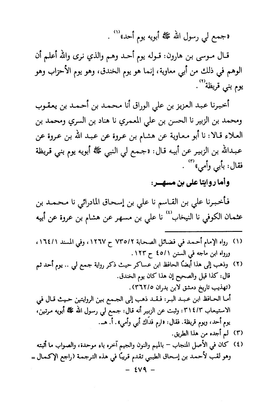 أَخْبَرَنَا عَبْدُ الْعَزِيزِ بْنُ عَلِيٍّ الْوَرَّاقُ أنا مُحَمَّدُ بْنُ أَحْمَدَ بْنِ يَعْقُوبَ وَمُحَمَّدُ بْنُ الزُّبَيْرِ نا الْحَسَنُ بْنُ عَلِيٍّ الْمَعْمَرِيُّ نَا هَنَّادُ بْنُ السَّرِيِّ وَمُحَمَّدُ بن العلاء قالا: نا أَبُو مُعَاوِيَةَ عَنْ هِشَامٍ بْنِ عُرْوَةَ عَنْ عَبْدِ اللَّهِ بْنِ عُرْوَةَ عَنْ عَبْدِ اللَّهِ بْنِ الزُّبَيْرِ عَنْ أَبِيهِ قَالَ: " جَمَعَ لِي النَّبِيُّ صَلَّى اللَّهُ عَلَيْهِ وَسَلَّمَ أَبَوَيْهِ يَوْمَ بَنِي قريظة قال: بِأَبِي وَأُمِّي " 3.
