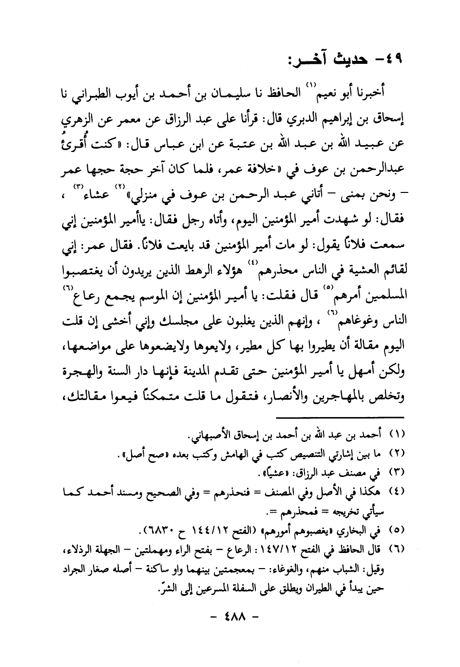 أَخْبَرَنَا أَبُو نُعَيْمٍ1 الْحَافِظُ نَا سُلَيْمَانُ بْنُ أَحْمَدَ بْنِ أَيُّوبَ الطَّبَرَانِيُّ نا إِسْحَاقُ بْنُ إِبْرَاهِيمَ الدَّبَرِيُّ قَالَ: قَرَأْنَا عَلَى عَبْدِ الرَّزَّاقِ عَنْ مَعْمَرٍ عَنِ الزُّهْرِيِّ عَنْ عُبَيْدِ اللَّهِ بْنِ عَبْدِ اللَّهِ بْنِ عُتْبَةَ عَنِ ابْنِ عَبَّاسٍ قَالَ: " كُنْتُ أُقْرِئُ عَبْدَ الرَّحْمَنِ بْنَ عَوْفٍ فِي ((خِلافَةِ عُمَرَ، فَلَمَّا كَانَ آخِرُ حَجَّةٍ حَجَّهَا عُمَرُ – وَنَحْنُ بِمِنًى – أَتَانِي عَبْدَ الرَّحْمَنِ بْنَ عَوْفٍ فِي مَنْزِلِي)) 2 عِشَاءً3، فَقَالَ: لَوْ شَهِدْتَ أَمِيرَ الْمُؤْمِنِينَ الْيَوْمَ، وَأَتَاهُ رَجُلٌ فَقَالَ: يَا أَمِيرَ الْمُؤْمِنِينَ إِنِّي سَمِعْتُ فُلانًا يَقُولُ: لَوْ مَاتَ أَمِيرُ الْمُؤْمِنِينَ قَدْ بَايَعْتُ فُلانًا. فَقَالَ عُمَرُ: إِنِّي لَقَائِمٌ الْعَشِيَّةَ فِي النَّاسِ مُحَذِّرُهُمْ4 هَؤُلاءِ الرَّهْطَ الذين يُرِيدُونَ أَنْ يَغْتَصِبُوا الْمُسْلِمِينَ أَمْرَهُمْ5 قَالَ فَقُلْتُ: يَا أَمِيرَ الْمُؤْمِنِينَ إِنَّ الْمَوْسِمَ يَجْمَعُ رِعَاعَ6 النَّاسِ وغوغاهم6، وإنهم الذين يَغْلِبُونَ عَلَى مَجْلِسِكَ وَإِنِّي أَخْشَى إن قلت الْيَوْمَ مَقَالَةً أَنْ يَطِيرُوا بِهَا كُلَّ مَطِيرٍ، وَلا يَعُوهَا وَلا يَضَعُوهَا عَلَى مَوَاضِعِهَا، وَلَكِنْ أَمْهِلْ يَا أَمِيرَ الْمُؤْمِنِينَ حَتَّى تَقْدَمَ الْمَدِينَةَ فَإِنَّهَا دَارُ السُّنَّةِ وَالْهِجْرَةِ وَتَخْلُصَ بِالْمُهَاجِرِينَ وَالأَنْصَارِ، فَتَقُولَ مَا قلت متمكنا فيعوا مقالتك،